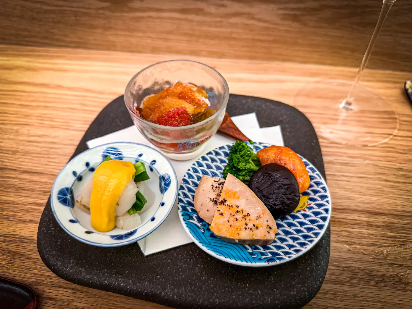 - (right) Japanese Ankimo (monkfish liver) with fresh vegetables. The monkfish liver was very delicious. The Japanese foie gras, in a way also known as the foie gras of the sea, had a nice savory, creamy texture to it, despite it appearing hard in texture visually. It was full of flavors and was decadent on its own. The fresh vegetables included shiitake mushroom cap and broccolini. I don’t remember what was the other thing there.