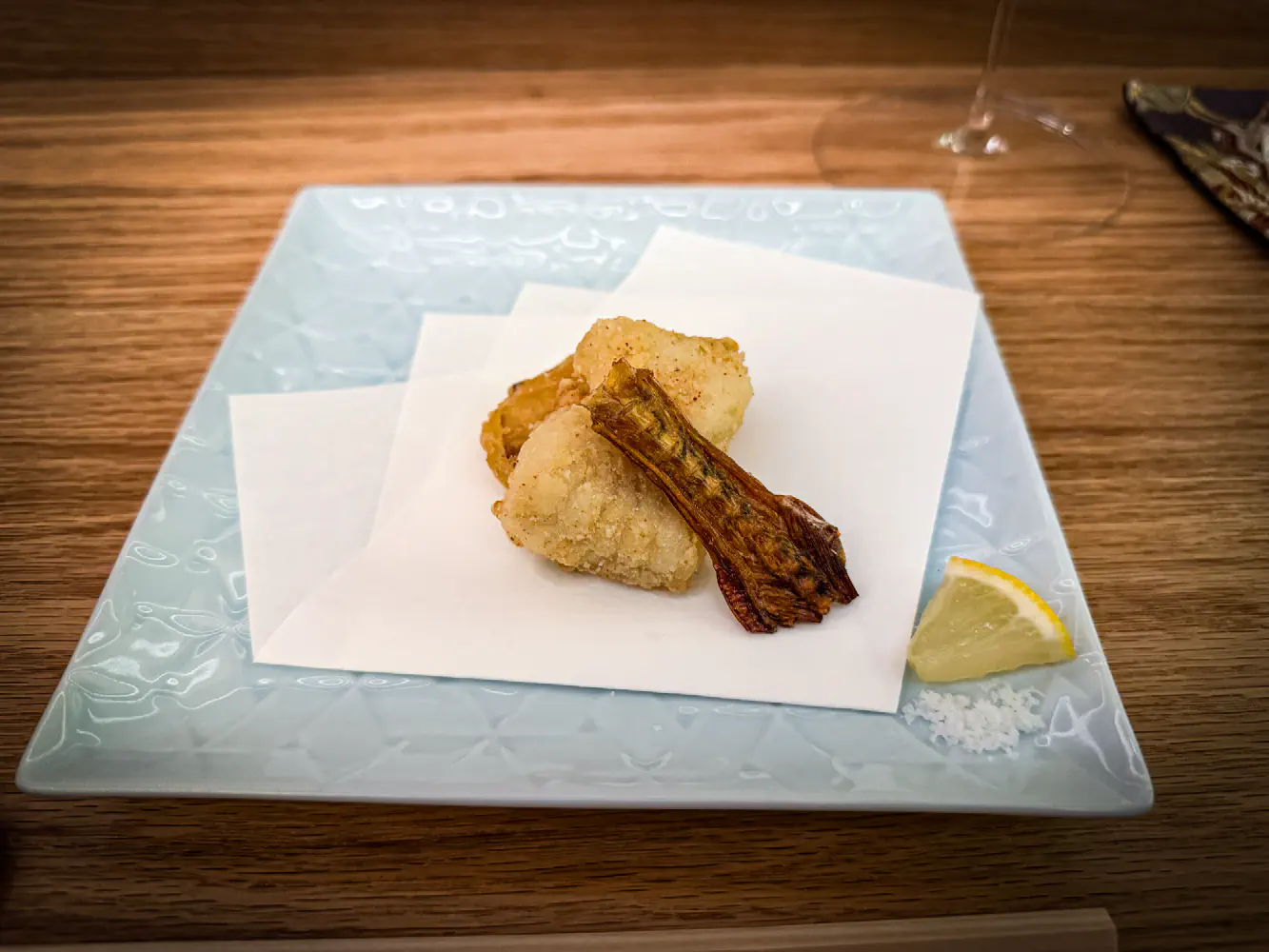 The Fugu (pufferfish) came karaage style, meaning it was deep-fried in a light batter. Fugu is most known to be a very poisonous fish, and if handled improperly, can be deadly. Satoshi, the sushi chef in front of us, was fortunately a certified pufferfish handler, so there were no issues here. The pufferfish meat texture-wise was surprisingly similar to monkfish, where it was dense and flaky. It also was surprisingly very sweet, delicate, and decadent. I can’t describe it enough of how much I’d love to come back to try this again, although I know it was a specialty for this evening. The long bone here was the spine of the pufferfish. They deep fry it, such that it was very crispy and delicious. It’s a fantastic balance to a flaky texture. This is one of the courses that I was very amazed by the not only the preparation but also the flavors.