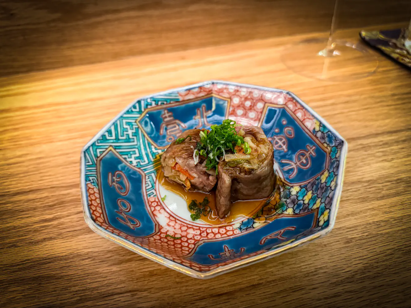 The Wagyu Udon was an A5 ribeye wagyu beef from Ibaraki Prefecture, wrapped around udon noodles, onion, carrots, shiitake, wrapped up similarly to temaki, and dressed with a sweet and sour flavored dashi. This was sublime and potent in flavors. Not only was the wagyu amazingly tender and cooked perfectly, but all the ingredients within the wrap had a perfect explosion of harmonious chemistry. The sweet and sour flavored dashi sauce was very umami.