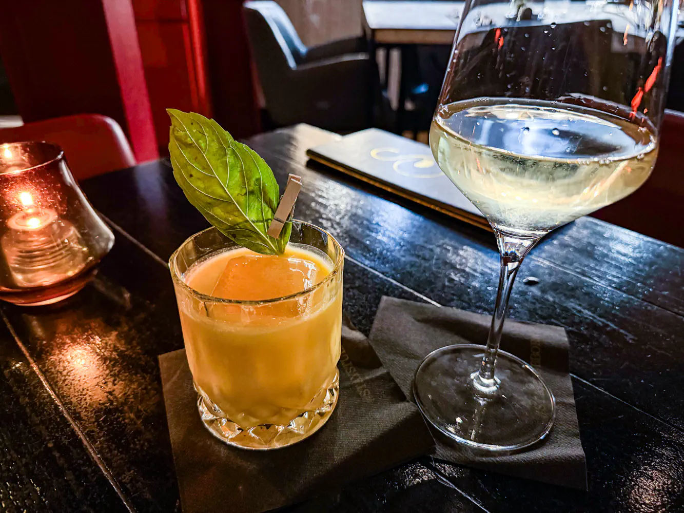 The Big Mango Tree ($20 - left) came with Diplomatico Planas rum, green chartreuse, elderflower, mango, coconut milk, fresh lime, and basil. My partner really enjoyed this because they are a fan of the coconut milk and mango flavors.