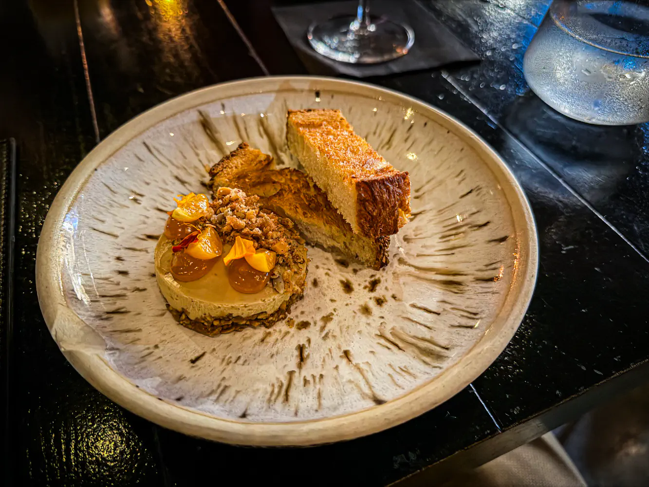 The Hudson Valley Foie Gras Torchon came with spiced gooseberry jam, peanut miso crumble, and Sullivan Street sesame sourdough. This was a play on peanut butter and jam. I actually enjoyed this a lot because it had some nice crunchy notes, and the gooseberry jam and peanut miso crumble definitely made it very playful. When topped onto the bread, it was a delightful harmony.