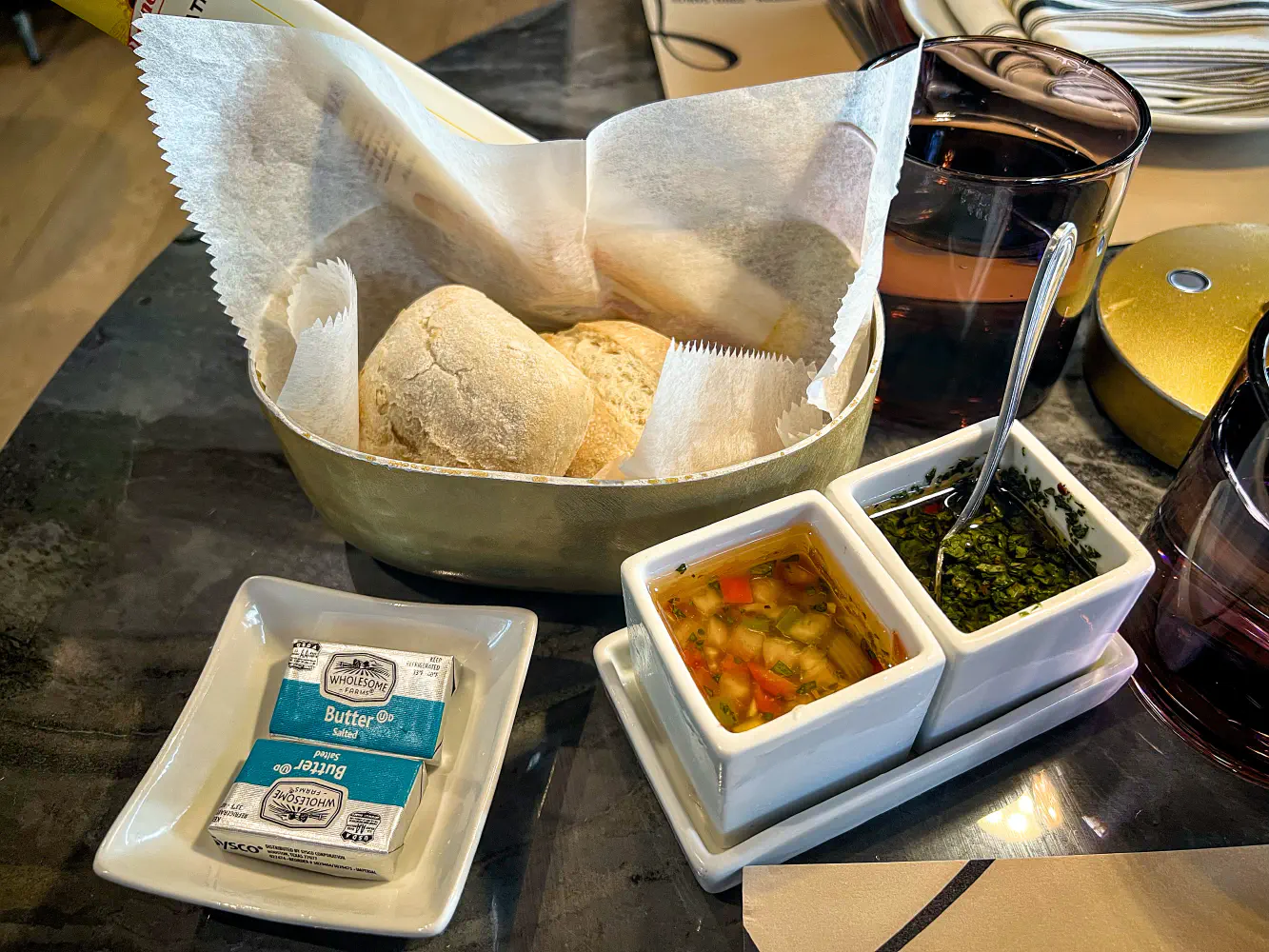 They give you some bread with some sauces to pair with the meat. One is similar to a Brazilian vinaigrette, and the other is chimichurri.