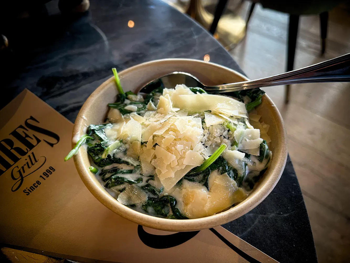 For the second side, we got the creamed spinach. This was topped with little pieces of parmesan cheese. This was decent, though the spinach turned out to be a bit watery for me.