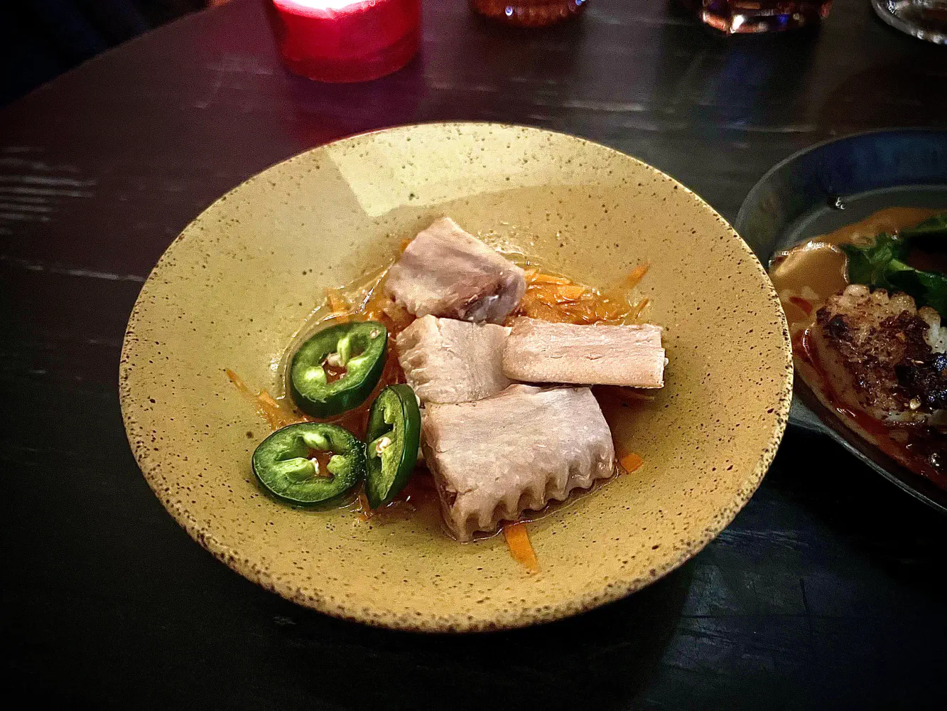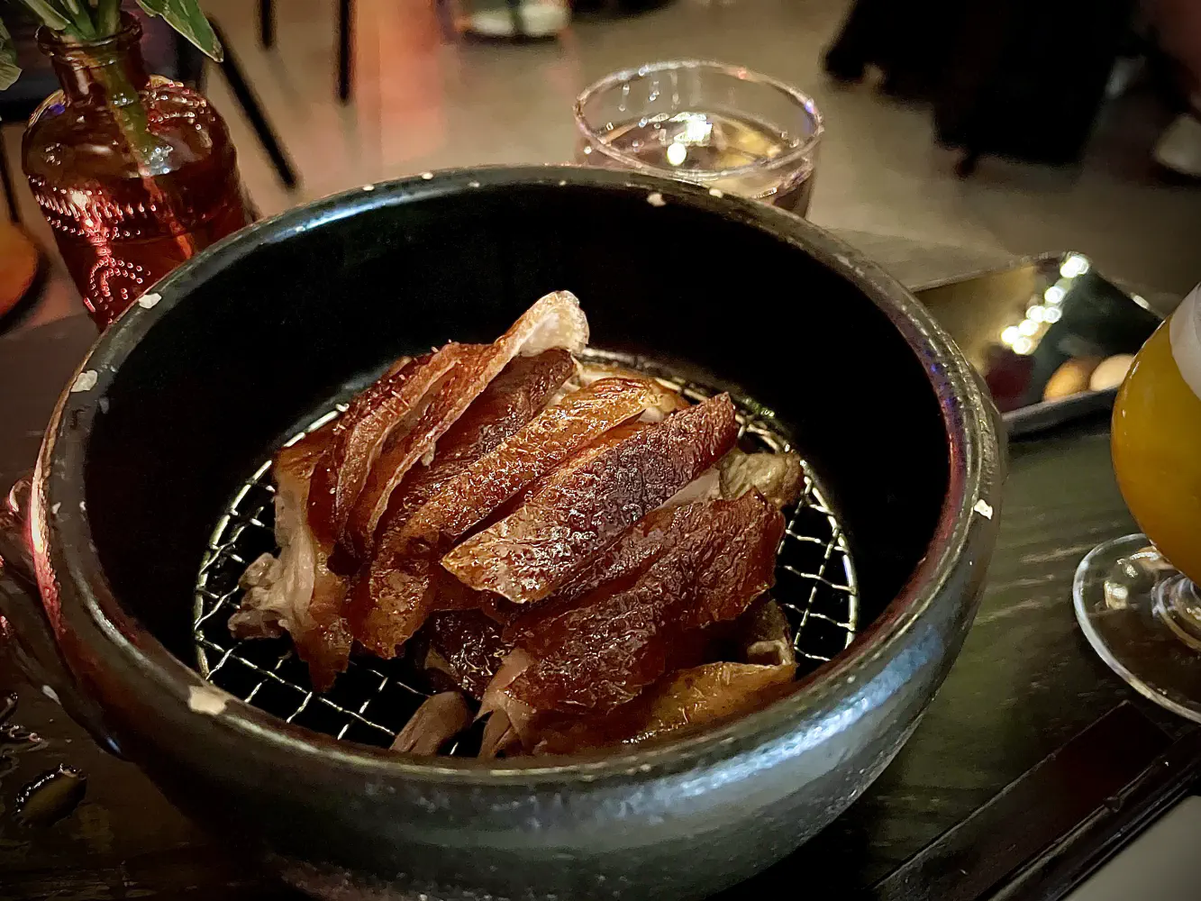 The Smoked Duck was served in a clay pot on this metal grate. They take some of the skin and put it on top for decorations. The meat here was definitely more meaty, but it was also heavily smoked in the pot. My partner didn’t enjoy this at all, so I ended up having to eat this by myself which wasn’t a bad thing. The only caveat with this aside from the smoke was that the skin was very greasy. When you bite into the skin, the fat seeps out like water and is extremely rich.