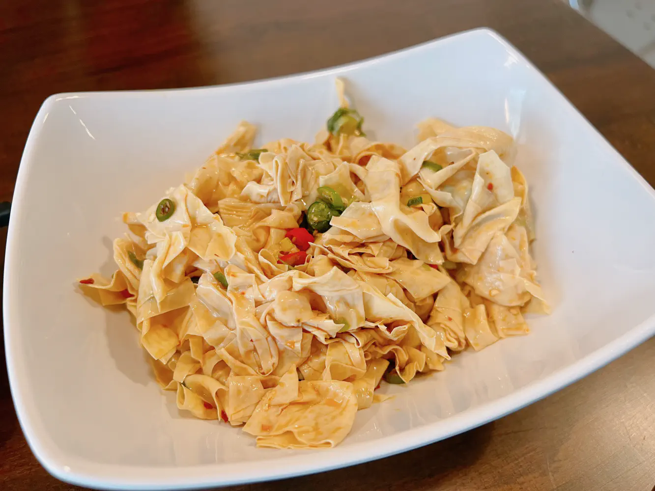 The spicy sauce with tofu skin ($9) came with loads of tofu skin and some light seasoning. This dish was served cold. The seasoning is typically chili oil, sesame oil, and some chopped red and green peppers. My partner really enjoyed this and devoured it as if it were their main dish.