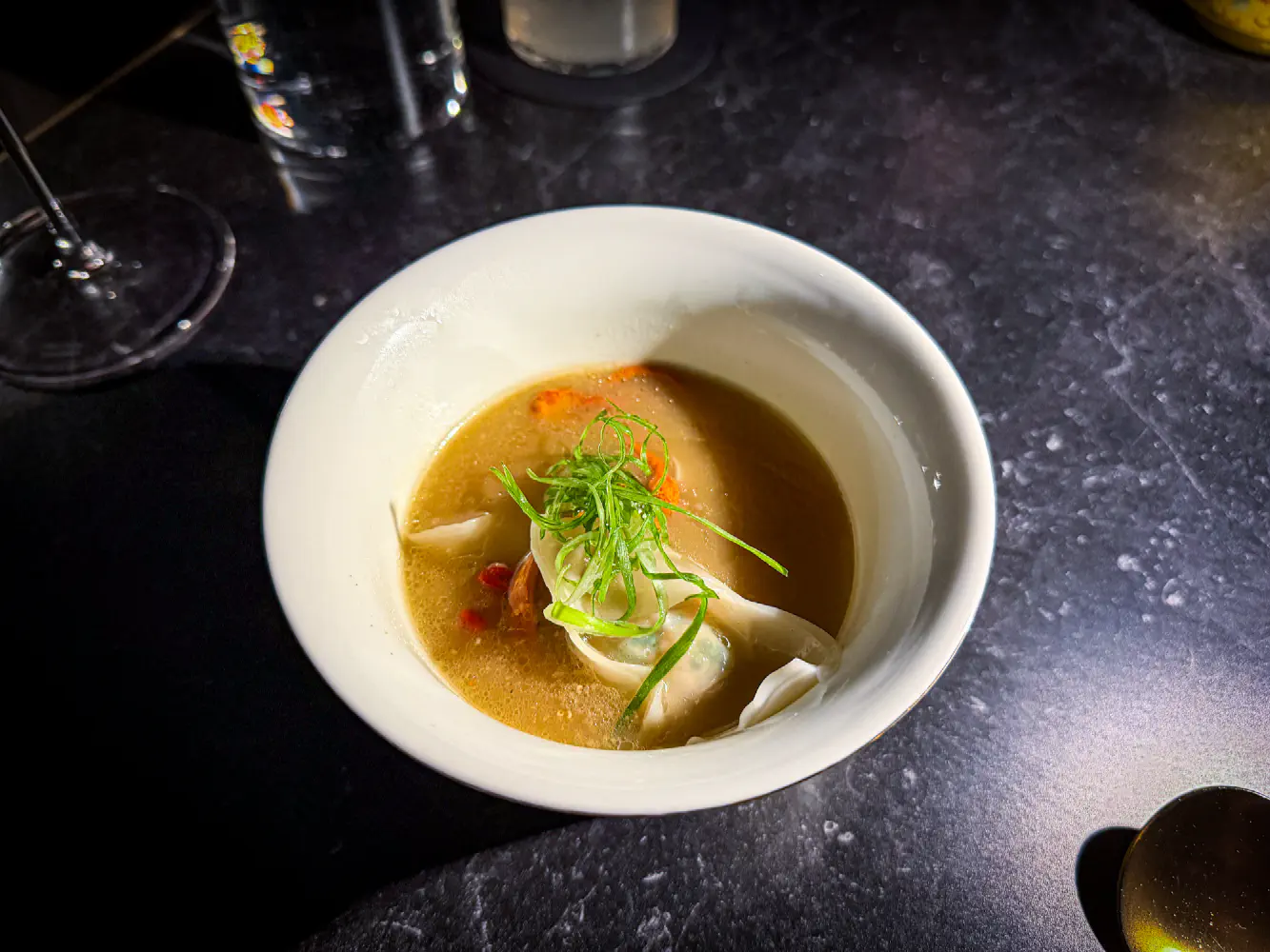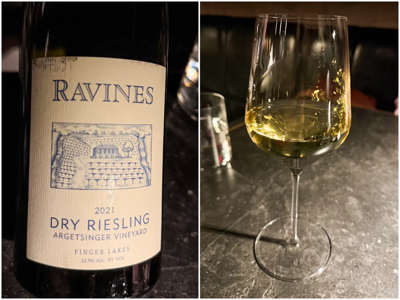 The glass of Dry Riesling ($22) came from Ravines, Argetsinger Vineyard, Finger Lakes, NY 2021. The Finger Lakes area in New York state is known for having interesting modern rieslings. This one is mineral forward, bright with citrus, floral, and flinty flavors. It smells like the limestone soil, and the flavors were quite decadent for me. It paired the best with the wonton course below.