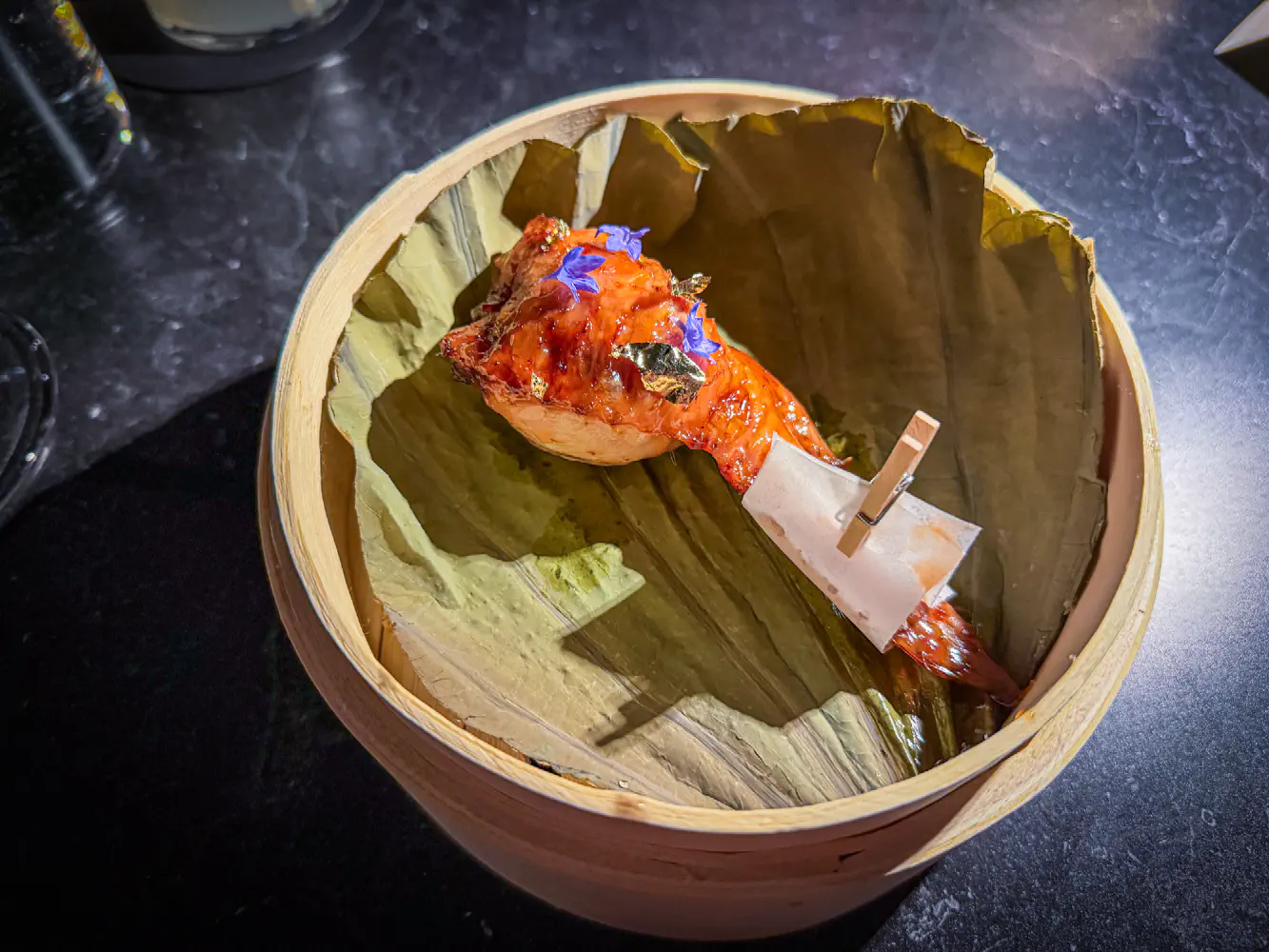 The ambiance in general is very dark, akin to a dark lounge clubby atmosphere. In the front is a bar where you can order any of the menu items a’la carte, and the dining room is the back where it’s primarily tasting only. The restaurant is more long than wide. In the dining room area, each table is lit by these portable LED lit lamps that are very bright and convey an intimate night out. The music is loud, playing hip hop type of music both in Chinese and English.