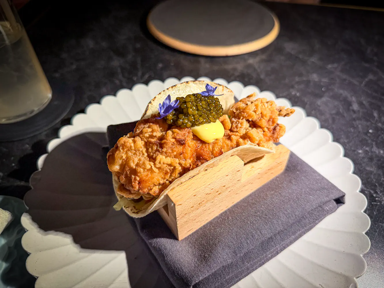 We ordered the optional KFC ($32) for the two of us. This had caviar, double fried chicken, house-made tortilla, pickled radish, and hoisin aioli. Although this was a fun play on fried chicken, I think this can be skipped. The problem with this optional course is that the chicken tasted very close to just a normal chicken tender. And the other flavors of the seasoning and garnish will overpower any remaining flavor or texture of the caviar. So in essence, you’re paying $32 for a fried chicken tortilla wrapped in a tortilla filled with pickled radish and hoisin flavors. If these flavors are unfamiliar, definitely give it a try. Otherwise, you can safely pass on this.