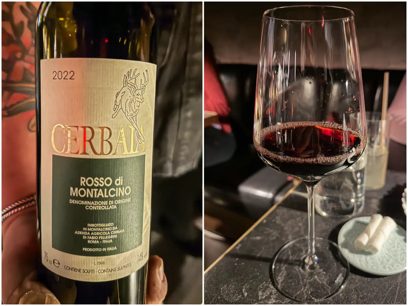 The glass of Sangiovese ($24) came from Cerbaia, Rossi di Montalcino, Tuscany, IT 2022. This is a younger, classical sangiovese that has a bright red juicy fruit forward flavor with high acidity and earthy flavors. This one was decent paired with the duck.