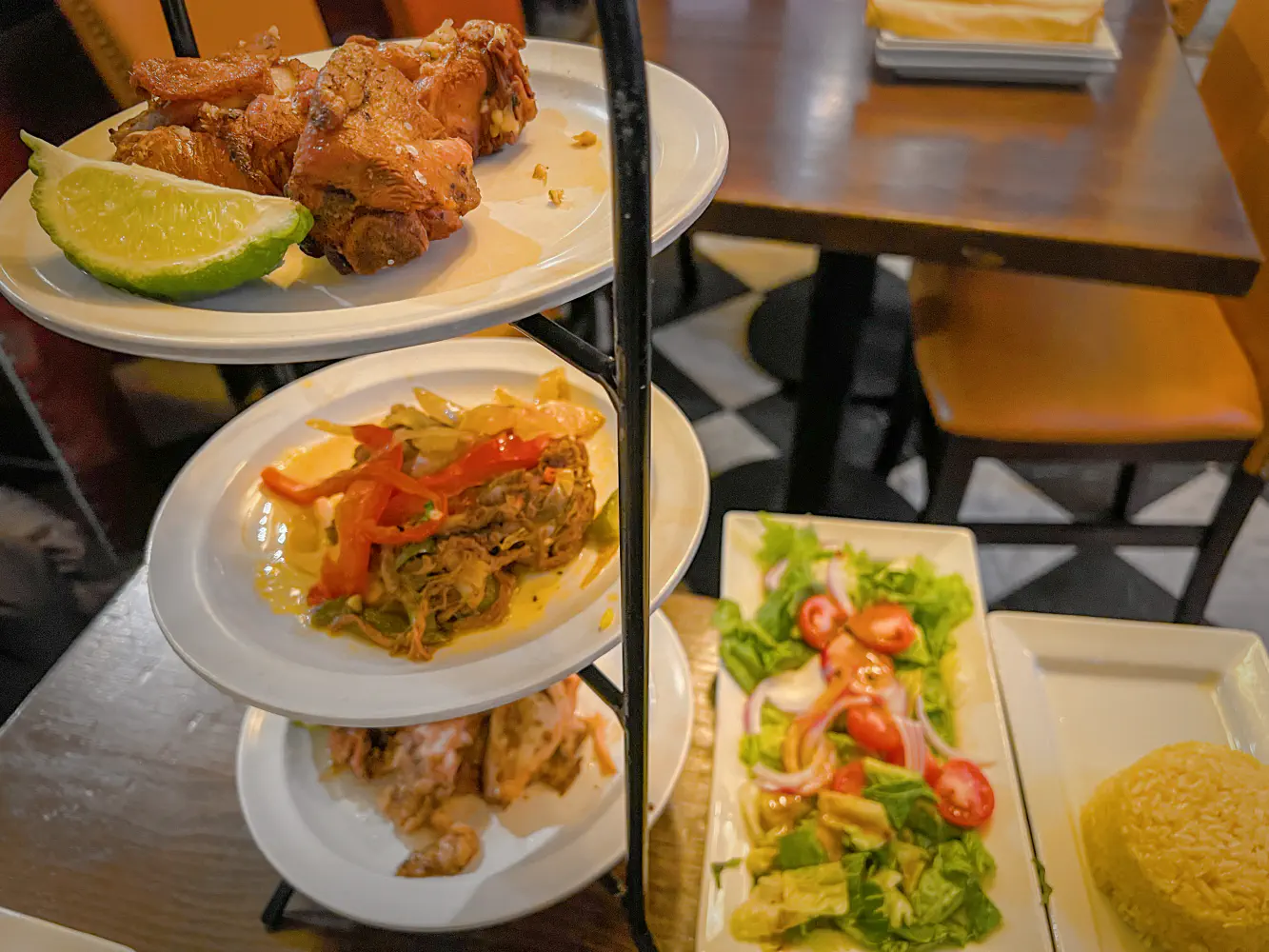 The Recorrido por la Havana ($29.95) was the Pork Lover’s Trio. It came with a tower of pernil, ropa vieja, and chicharrones de pollo. It came with yellow rice and a side salad. I did not realize it would come in this tall tower, but it was fun to look at first. It was actually not so great pulling food off the tower since the plates would rattle against the cage as you pressed on it.