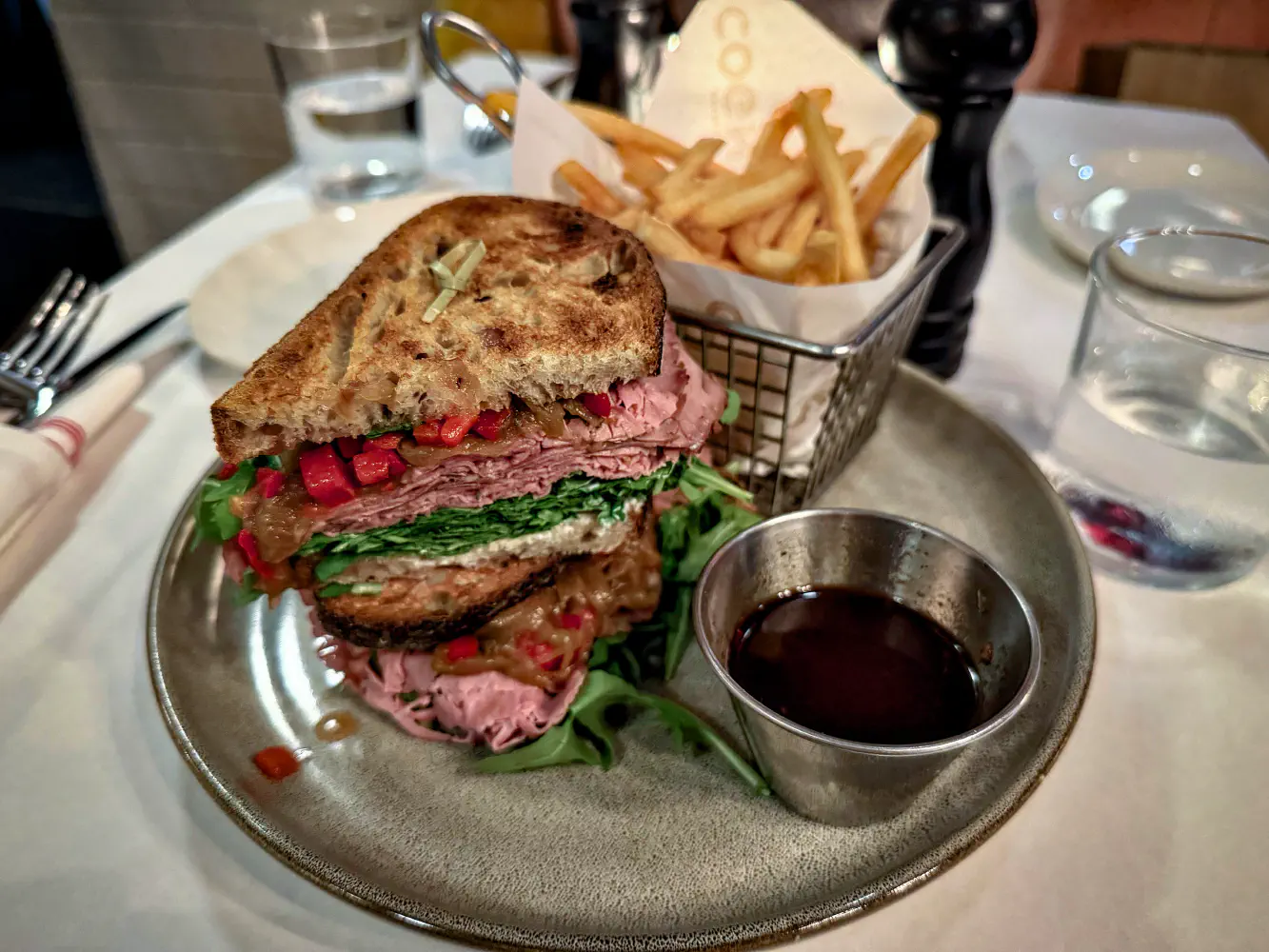 The French Dip ($26) came with roast beef, horseradish sour cream, onion confit & arugula, and served on sourdough bread and side of Bordelaise sauce. The bread was toasted to a crisp, so it was a little rough to eat as it tore a bit of the upper and bottom parts of my mouth. The overall flavors of this were pretty good though. I didn’t taste the flavors of the horseradish sour cream prominently, but you can tell there was some type of sour flavor there. The neatly, thin shaved roast beef was good. The Bordelaise sauce was a bit disappointing because it was a bit too wet and sweet. In some ways, the sandwich is decent as a standalone without the sauce.