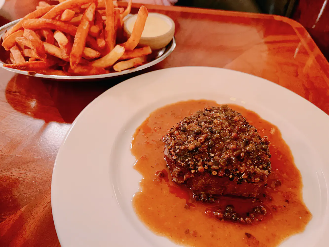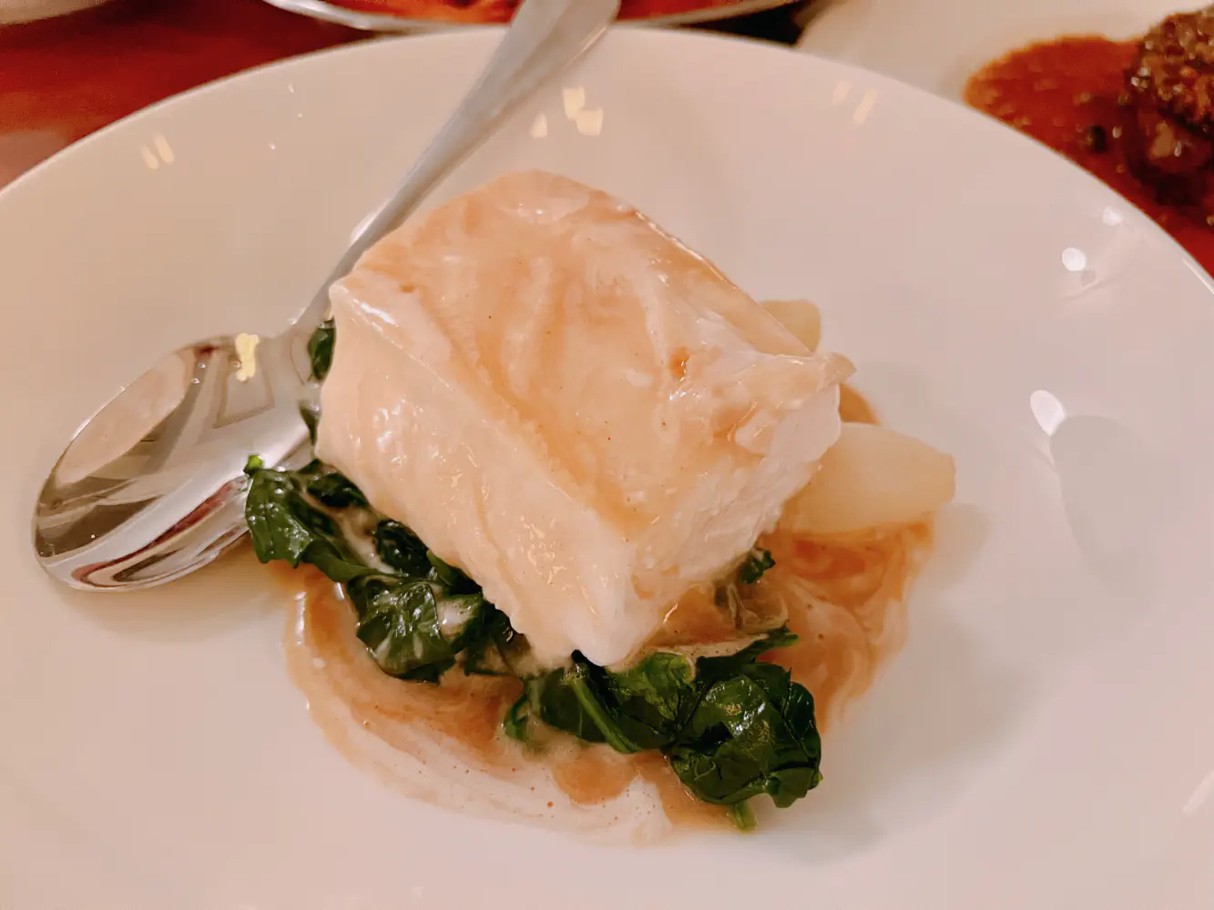 The Bison Au Poivre ($64) came with a bison steak, pepper sauce, and a side of fries. The bison was perfectly cooked, and it was so very soft. The au poivre sauce, basically cracked peppercorn sauce, was delicious with lots of wine and peppery flavors. It was well balanced and connected nicely with the bison meat. The fries were surprisingly very good. They were similar to “well done” fries in that the outside had that very nice crispy texture and the inner flesh was very soft and starchy. The sauce they served was some sort of aioli. You could eat the fries without it fine. Going back and forth between the halibut and bison was a great suggestion from our waitress because it kept things from becoming too intense in one particular tasting profile. Value wise and despite it being very delicious, this was kind of expensive even as a shareable item.