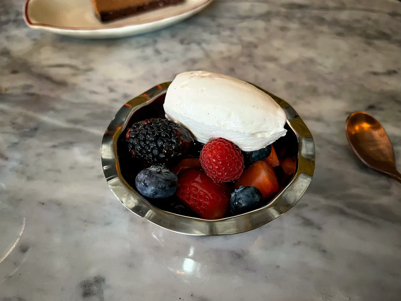 We both each received a Berries & Creme for dessert. These were fresh blueberries, strawberries, and blackberries with some cream on the side. On the bottom, there was some type of jam. Everything together was surprisingly very tasty and refreshing.
