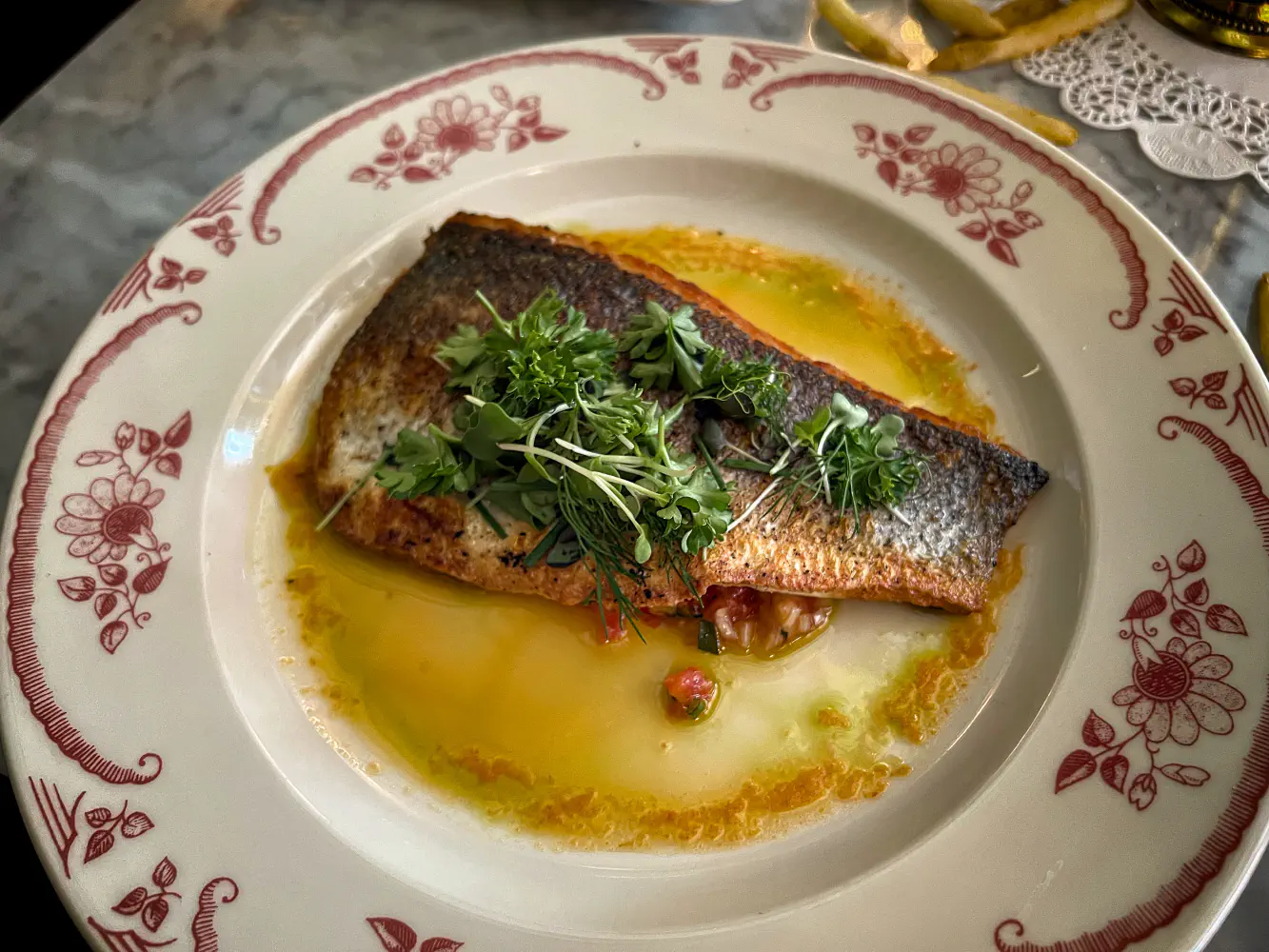 For my partner’s main course, they ordered the Branzino. This was slightly overcooked as it had a nice crisp, but the meat was on the drier side.