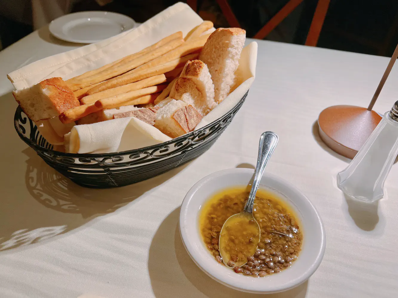 The complimentary bread came with breadsticks and focaccia and served with olive oil soaked with capers.