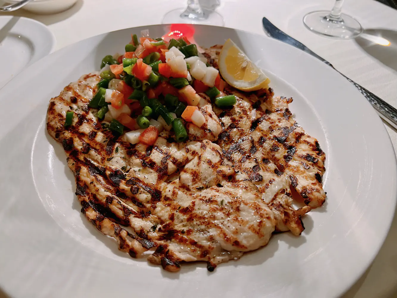 The Battuta di Pollo ala Griglia was grilled thinly pounded chicken breast with string beans, potatoes, and tomato salad. The chicken seemed like it wasn’t seasoned much, and the char from the grill stood out a lot. The salad that was on top of the chicken didn’t really add any value or flavors. It just seemed unseasoned. The lemon wedge helped a little. It felt like this was a healthy option.