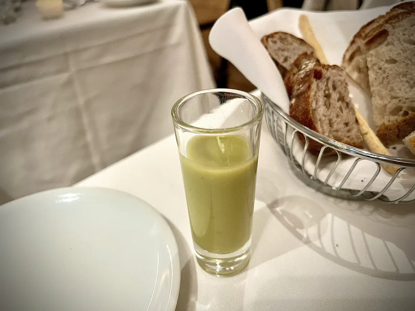 They also gave a shot of fava bean puree. This had a fluid, smudge consistency that was very fava bean forward.