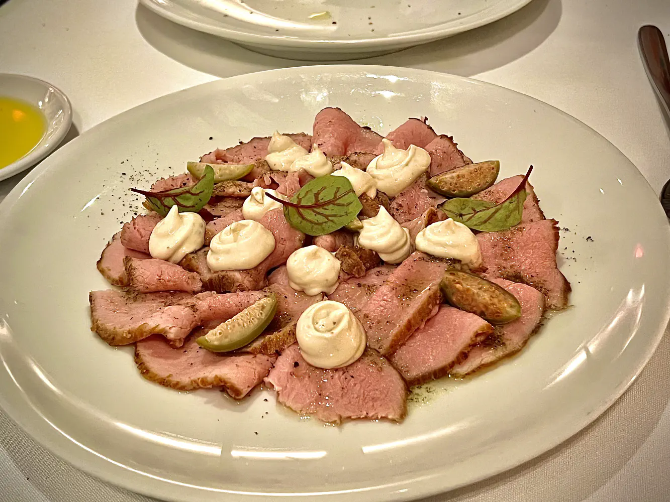 The Vitello Tonnato ($30) was tender sliced roasted veal with yellowfin tuna and anchovies sauce, caperberries, and lemon vinaigrette. They gave a generous portion of veal here, and everything here was good. The caperberries tasted like capers, so they were salty to the bite. But once you combine it with the veal and white anchovies sauce, it was very good.