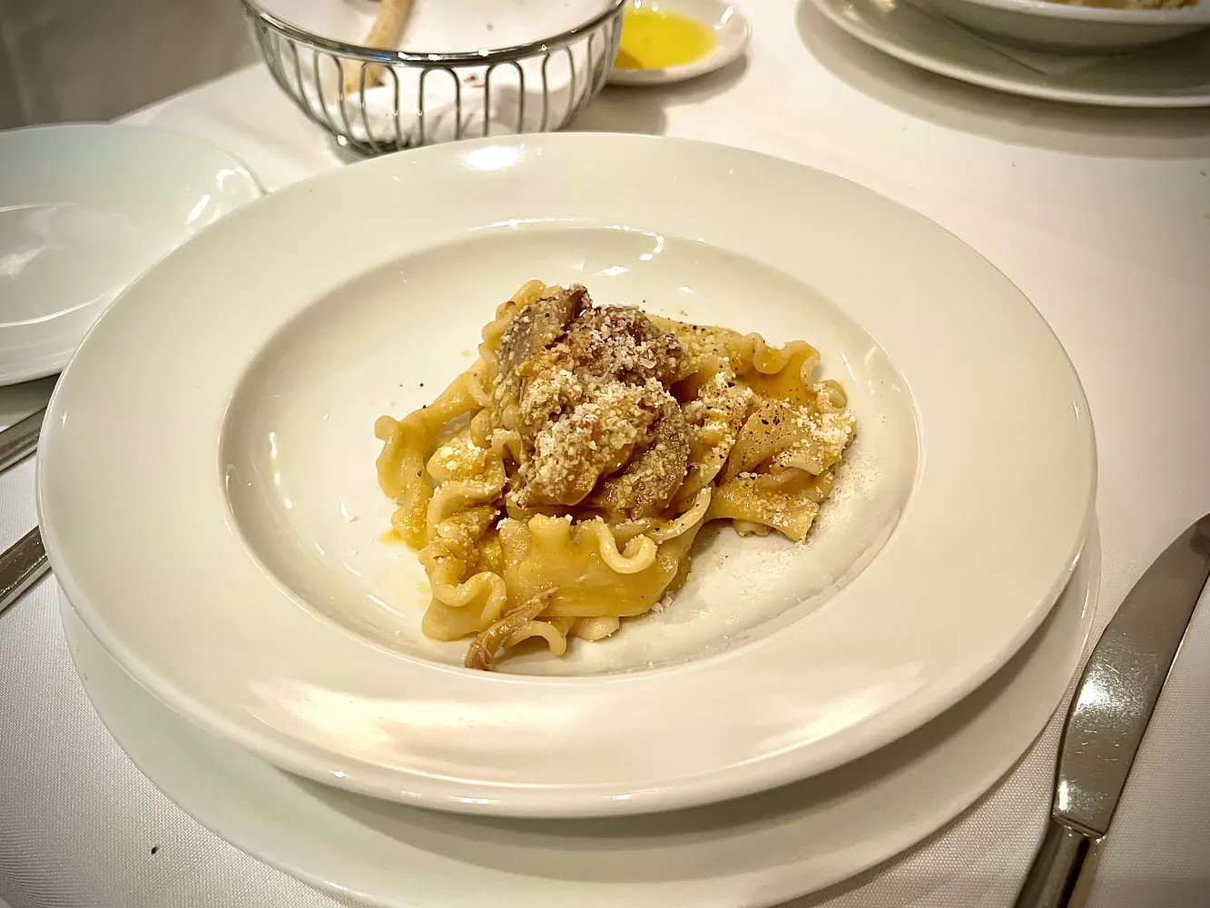 The Malfalde All’Anatra ($37) came with homemade mafalde pasta with braised duck leg and parmigiano Reggiano ragout. They were happy to divide this into 2 plates for us. The pasta was cooked perfectly al dente, and the braised duck meat was juicy and decadent.