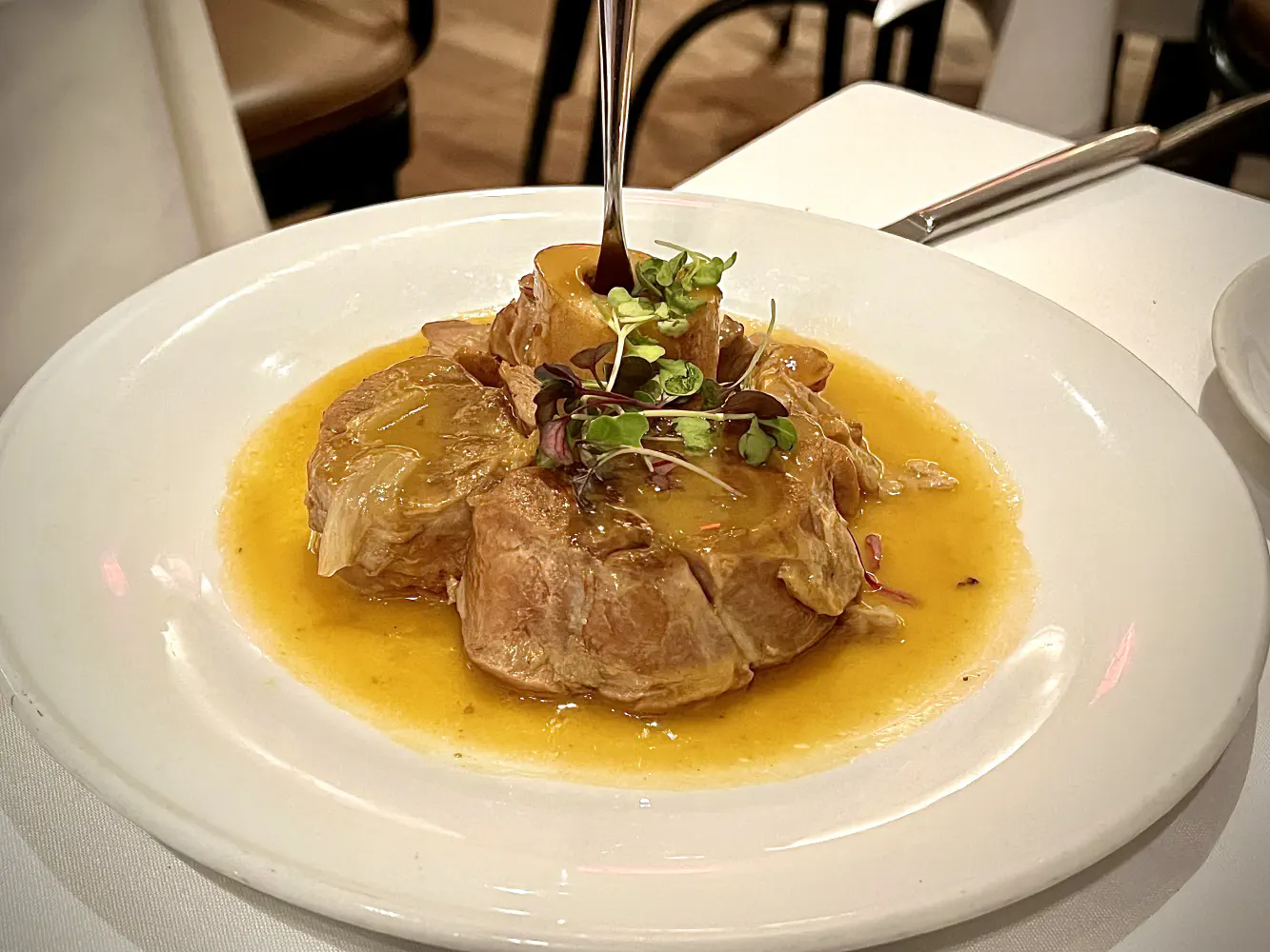 The glass of Rosso di Montefalco came from Arnaldo-Caprai, Italy 2021. This red blend wine was made from sangiovese, sagrantino, and merlot grapes. It’s a medium body with notable cherry and oaky notes. It was also very smooth to drink, but not very complex. I ordered this specifically to go with the veal later on.