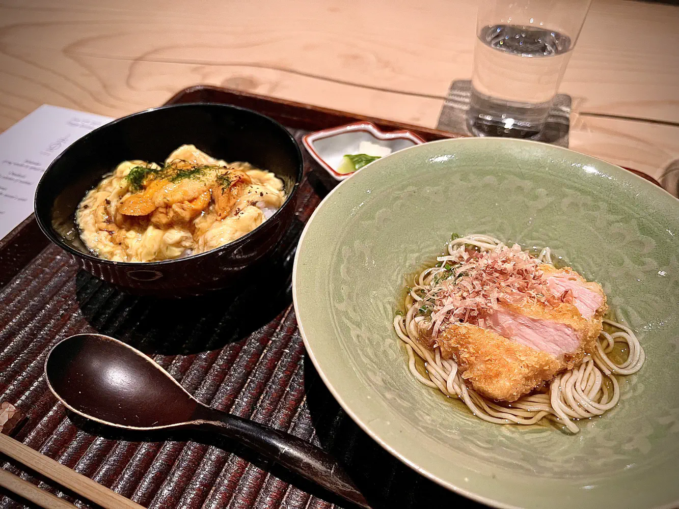 The Oshokuji was a clay pot cooked white rice with tsukemono and chilled housemade soba. The rice had drizzled egg and was topped with uni. This style makes it very light and fluffy. On the right, there was panko fried chicken served on top of cold noodles with Japanese style curry broth.
