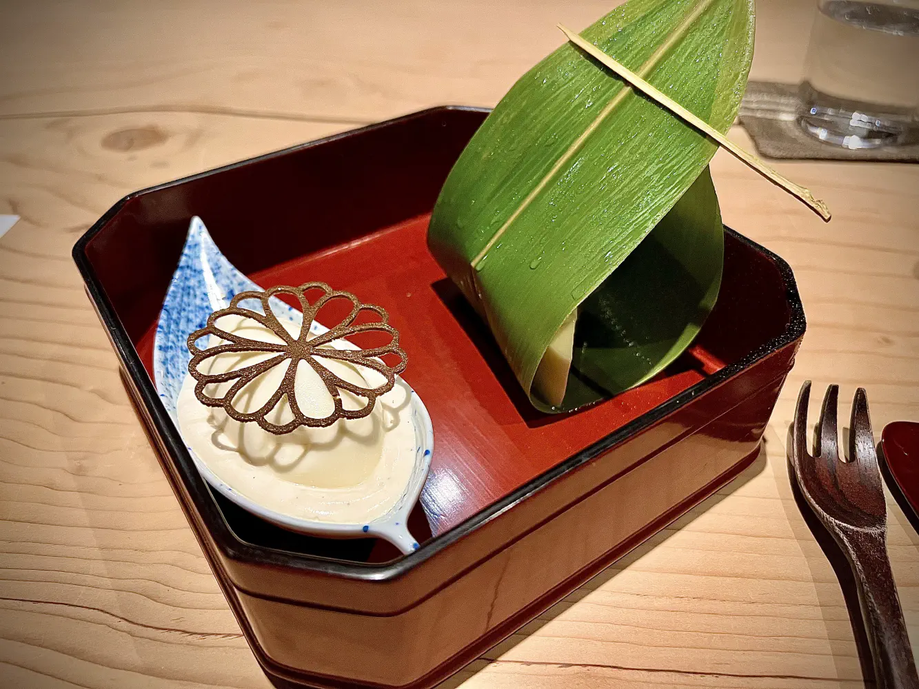 On the right, there was a leaf wrapped with soy bean jelly and red beans. This didn’t have much flavor to it for me, though it reminded me of coconut jelly.