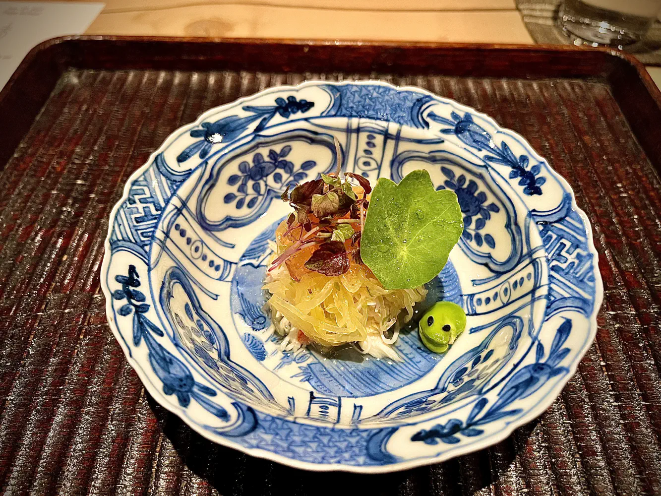 The Saizuke was spring noodles to refresh the soul. The dressing was an olive oil dashi vinaigrette. The noodles were layered with shiso, and they decorated a little fava bean with some sesame to hint a frog. The noodles were really good as expected, and this really complements the summer weather well.
