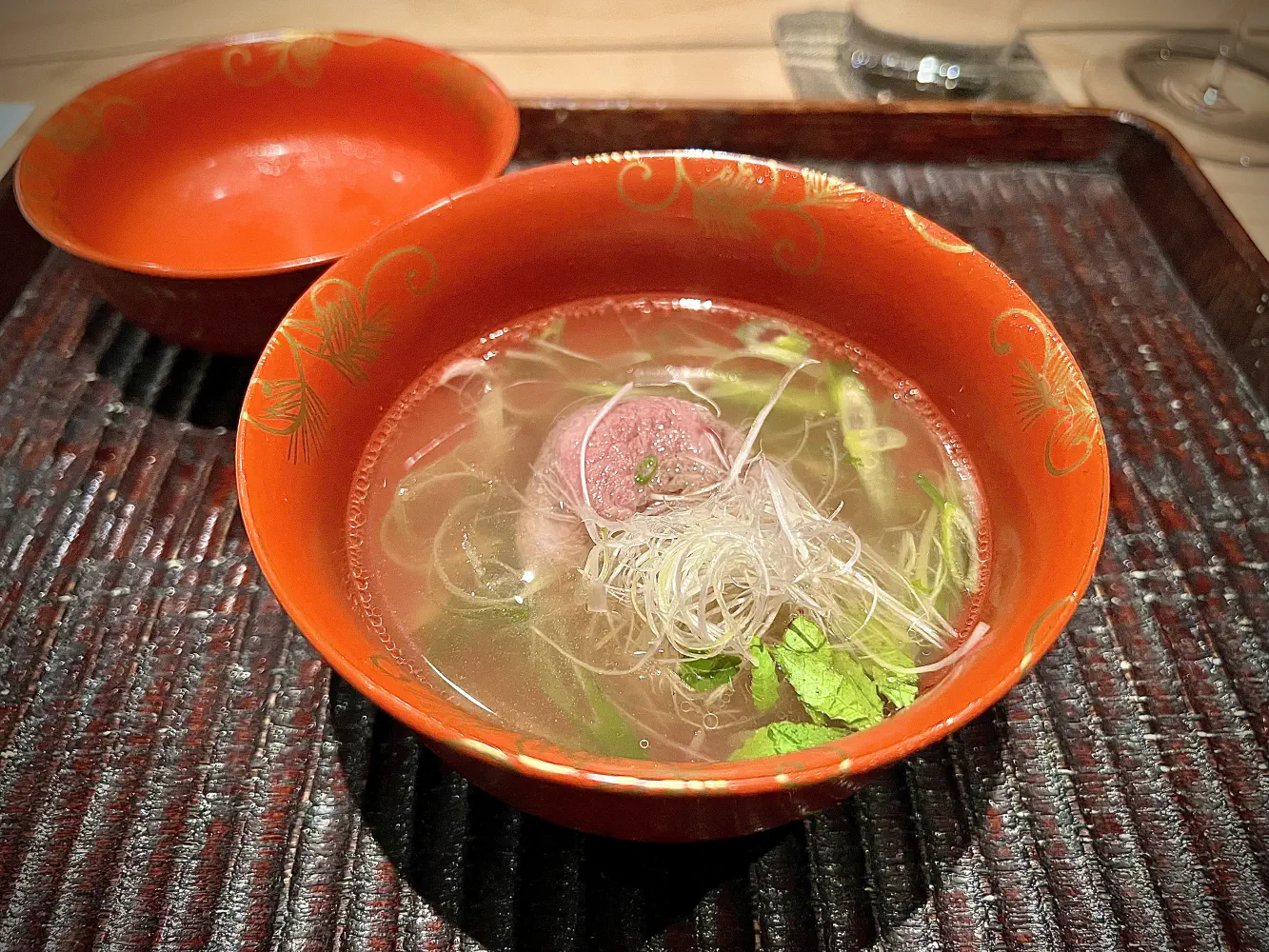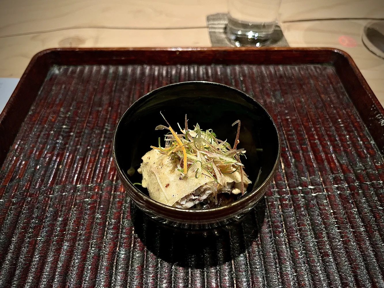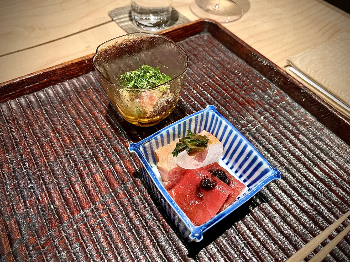The Agemono was a lightly fried bite with a bright and clean broth. The fish was an aji (Japanese horse mackerel) that was slightly fried. Underneath was an acidic dashi with a lot of seasoning. They asked that you mix everything together. Funny enough, the diners next to us thought it was a little fishy because they didn’t mix. Aji has a very specific taste, and to some, it’s probably acquired. Nonetheless, the aji mixed with the soup was very good.