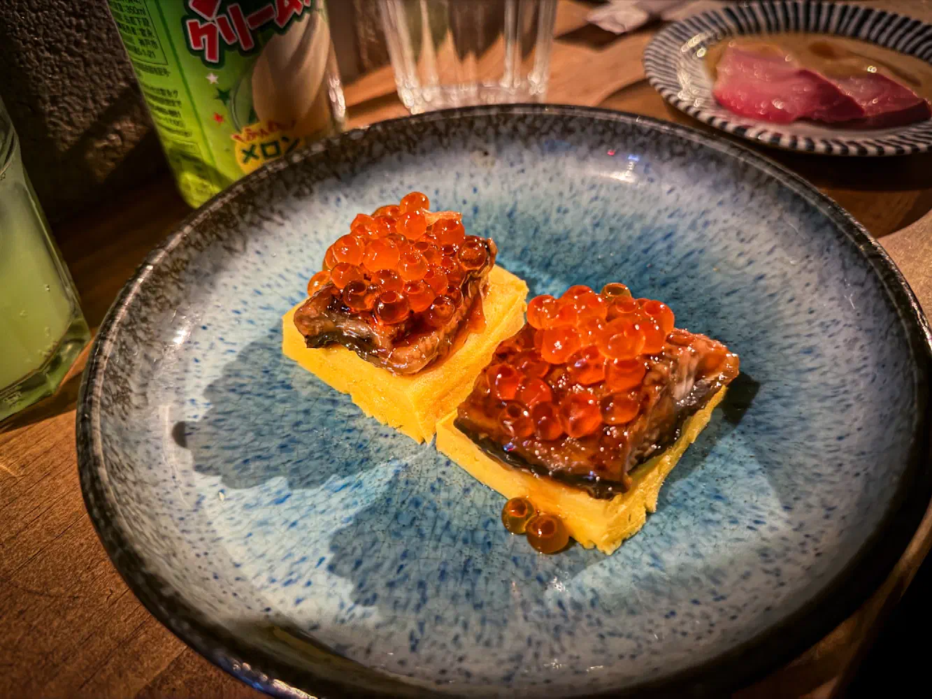 The Unagi Tamagoyaki ($10) came with eel, sweet omelet, and salmon roe. This is basically the typical eel slice on top of a sweet egg (tamago) with some salmon roe. I made the mistake of trying to grasp the egg and using that as the vessel for everything else. Instead, I should’ve used the spoon to prevent spillover of the salmon roe or total collapse of the sweet egg.