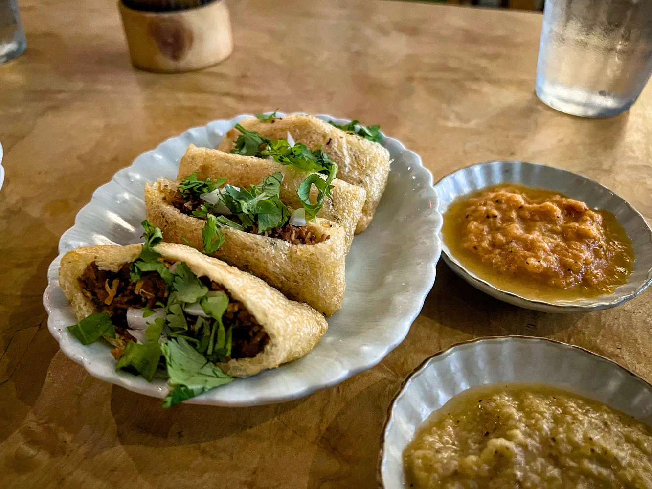 The Japanese “Tacos” ($14) came with grilled tofu skin stuffed with chorizo, jalapeno, and cilantro. The tofu skin was very similar to any other tofu skin pouch out there. The combination of the chorizo, jalapeno, and cilantro tasted decent and plain. They do provide 2 sauces for dip, where the red is supposedly more spicy and the green is more mild. Either sauce was mild in spiciness.