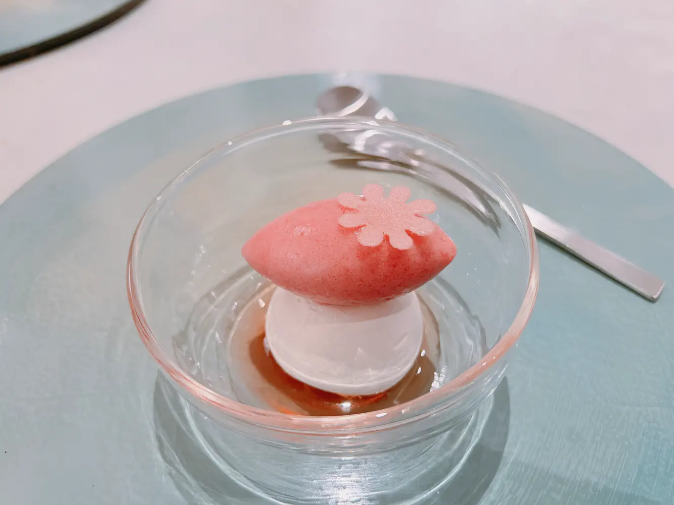 The Pear Pavlova came with Blood Orange Coulis, Omija Punch, and Pear Hibiscus Sorbet. The hibiscus sorbet was absolutely delightful. This course is basically your palette cleanser because you will get a lot of bright, acidic notes that will reset your palette for the final dessert dish. The white cone is basically a dome-like meringue casing that houses some tiny pear square cuts. It is probably more citrus sour than sweet.