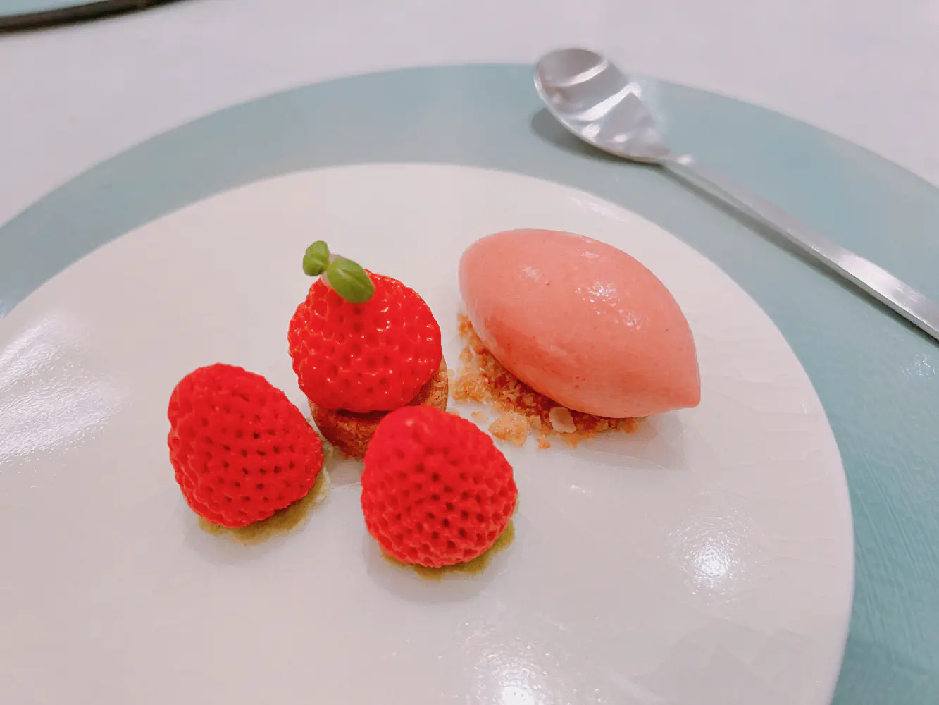 The Strawberry came with Creme Au Fraise, Green Apple Gelee, and Strawberry Ice Cream. Can you tell which strawberry(-ies) is real or fake? This is very playful dessert that is absolutely delicious. The strawberry fruit is super sweet just like the ones you would buy at the farmers market. The other fake strawberry(-ies) had a soft, jelly type of consistency. When you bite into it, they had a lot of cream texture sensations. And lastly, the strawberry ice cream was just simply superb. For me, it was the right amount of sweetness and tart, so that I didn’t feel like it was overpowering dessert sensations.