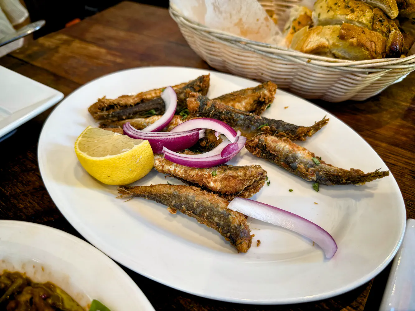 The Sardines (0.26 lbs at $5.20; $20/lb) were fried and fully edible despite the bones. They were pre-marinated in cumin and a bunch of other seasoning.