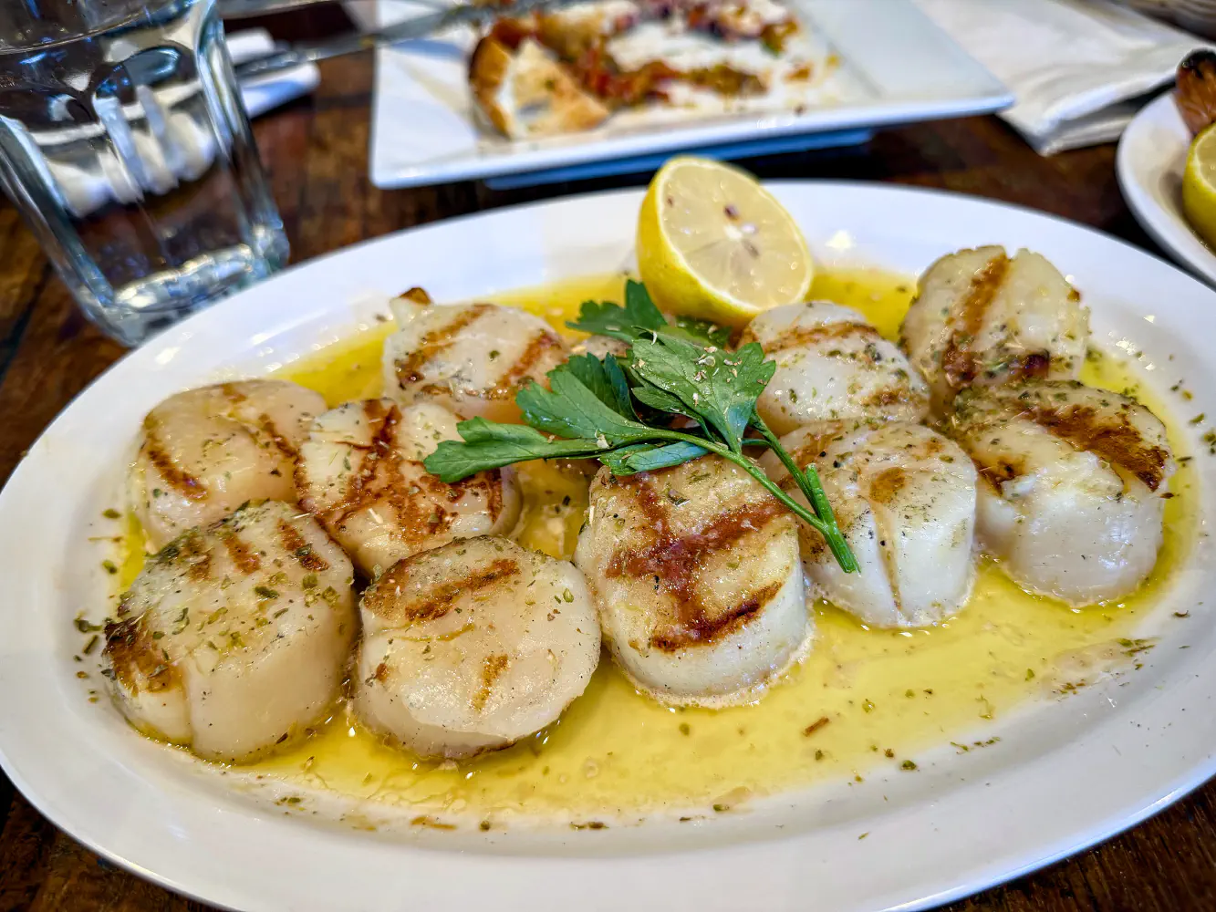 The Scallops (0.98 lbs at $33.31; $33.99/lb) were cooked perfectly. They were ordered grilled and dressed with olive oil and butter. The scallops were translucent and very fresh.