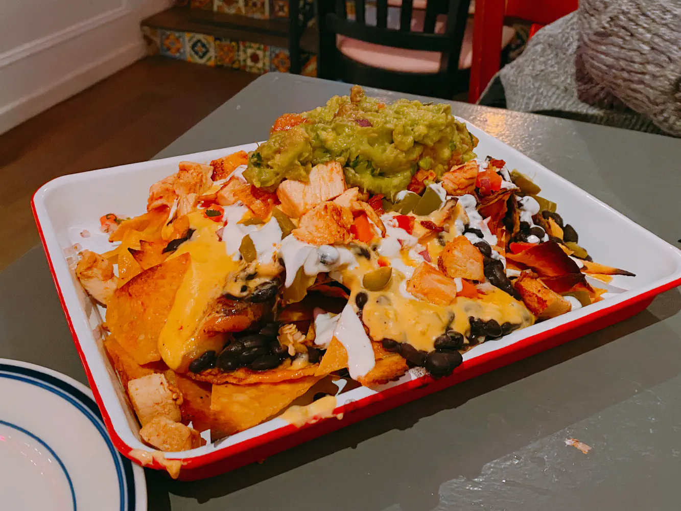 The love me some nachos came with chicken, three cheese blend, house pickled jalapeno and carrot, sour cream, pico de gallo, black beans, and guacamole. These nachos were pretty good and definitely reminded me of when I made nachos at home. The liquid cheese literally tasted like the melted nacho cheese. The chips were thin, crispy, and salted. They kind of reminded me a bit of the Chipotle citrus salt. The rest of the ingredients were pretty standard for nachos, but it was all very plentiful and good.