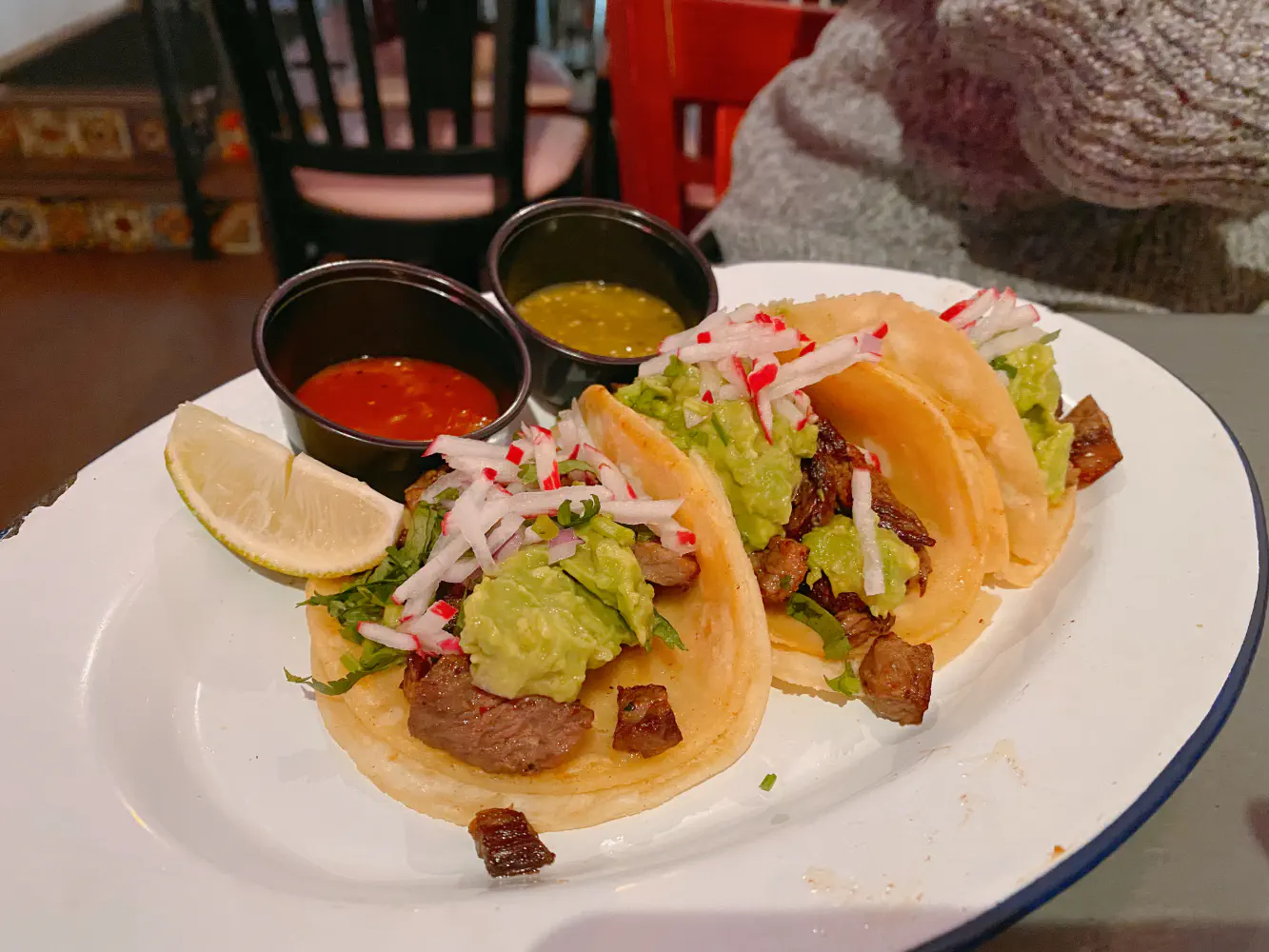 The carne asada tacos came with steak, red onion, cilantro, guacamole, and radish. It was served with red salsa and green salsa. The seasoned steak was pretty tender, and the tortillas were good too.