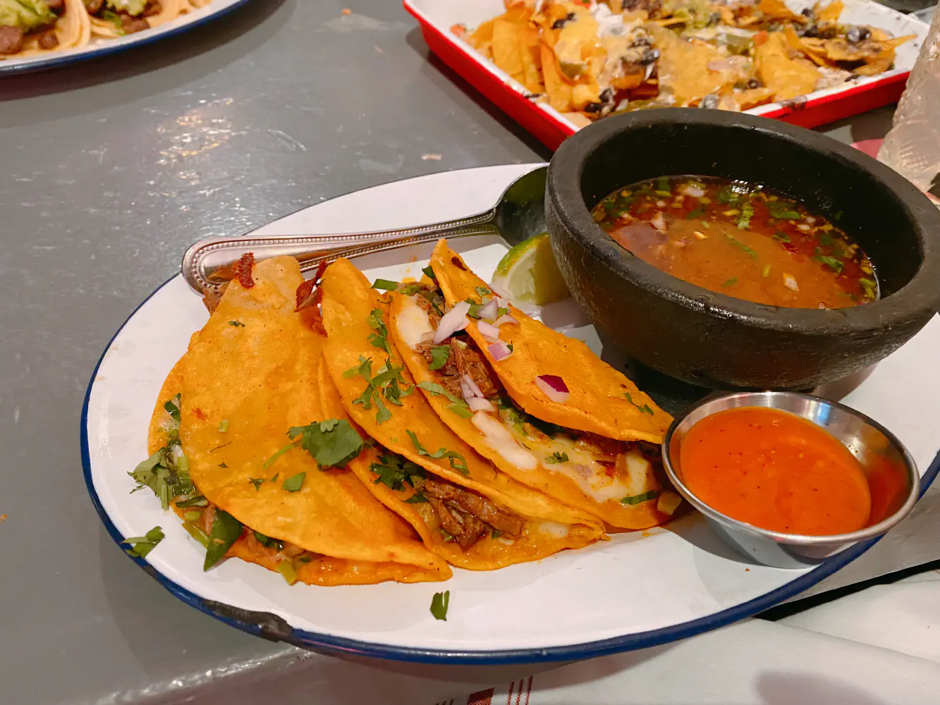 The birria tacos came with chihuahua cheese, short rib birria, onion, cilantro, spicy salsa roja, and consomme. The birria was fork tender and pretty delicious. The tacos themselves were fried with the contents together. The consomme was good to dip the tacos with, but I was not that big a fan of the taste of the broth. It reminded me of pozole or menudo broth but with some gamey after flavors. The lime helped it a little.