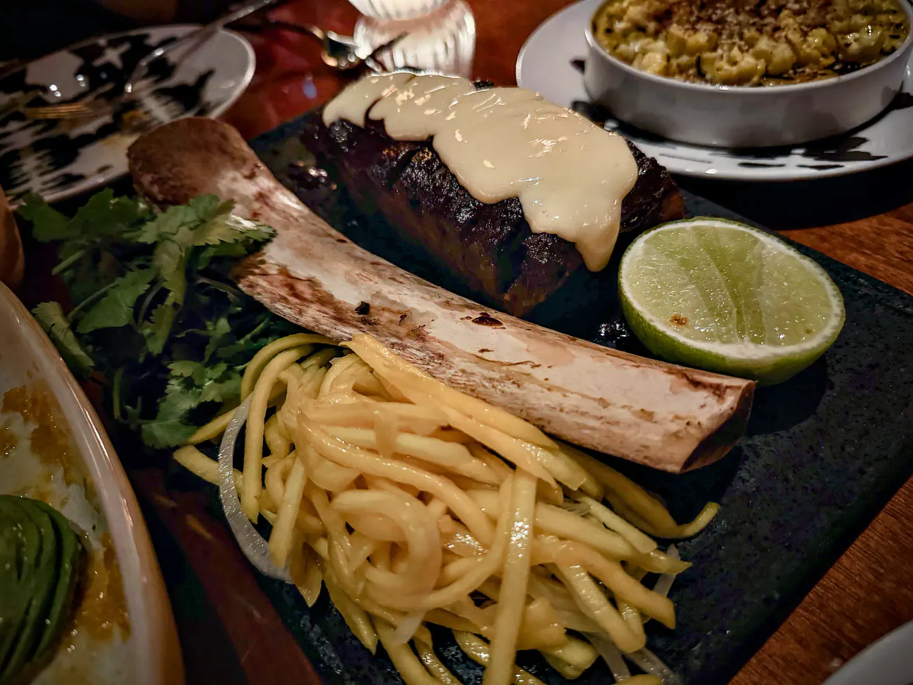 The Long-Bone Short Rib Quesabirria ($75) came with consomme, mango slices, tortillas, and cilantro. The short rib had some melted cheese on top. The short rib was very tender and flavorful. It had a well-balanced amount of fat to it. When you wrap it with the mango slices and cilantro and dip it into the consomme, it was pretty tasty. There are two notes that are worth calling out. The tortillas they give you are insanely small. Because it barely covers the surface area of a slice of short rib, it means it can be a bit messy with your hands and fingers to eat. Otherwise, the flavor is there, and it was delicious.