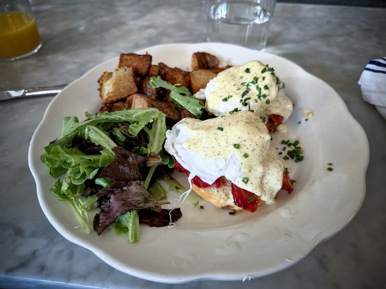 The Arden Benedict ($17 smoked Berkshire ham, $18 pastrami sliced salmon, $24 Maryland crab cake) came with Hollandaise, breakfast potatoes, and mixed greens. My partner ordered the Maryland crab cake, and I ordered the pastrami sliced salmon. The crab cake tasted OK. It had that frozen crab flavor, which I’m not that fond of, but it was decent. The pastrami salmon had a surprisingly chewy texture as opposed to a raw salmon texture. Everything else met expectations, so not much to rave about.