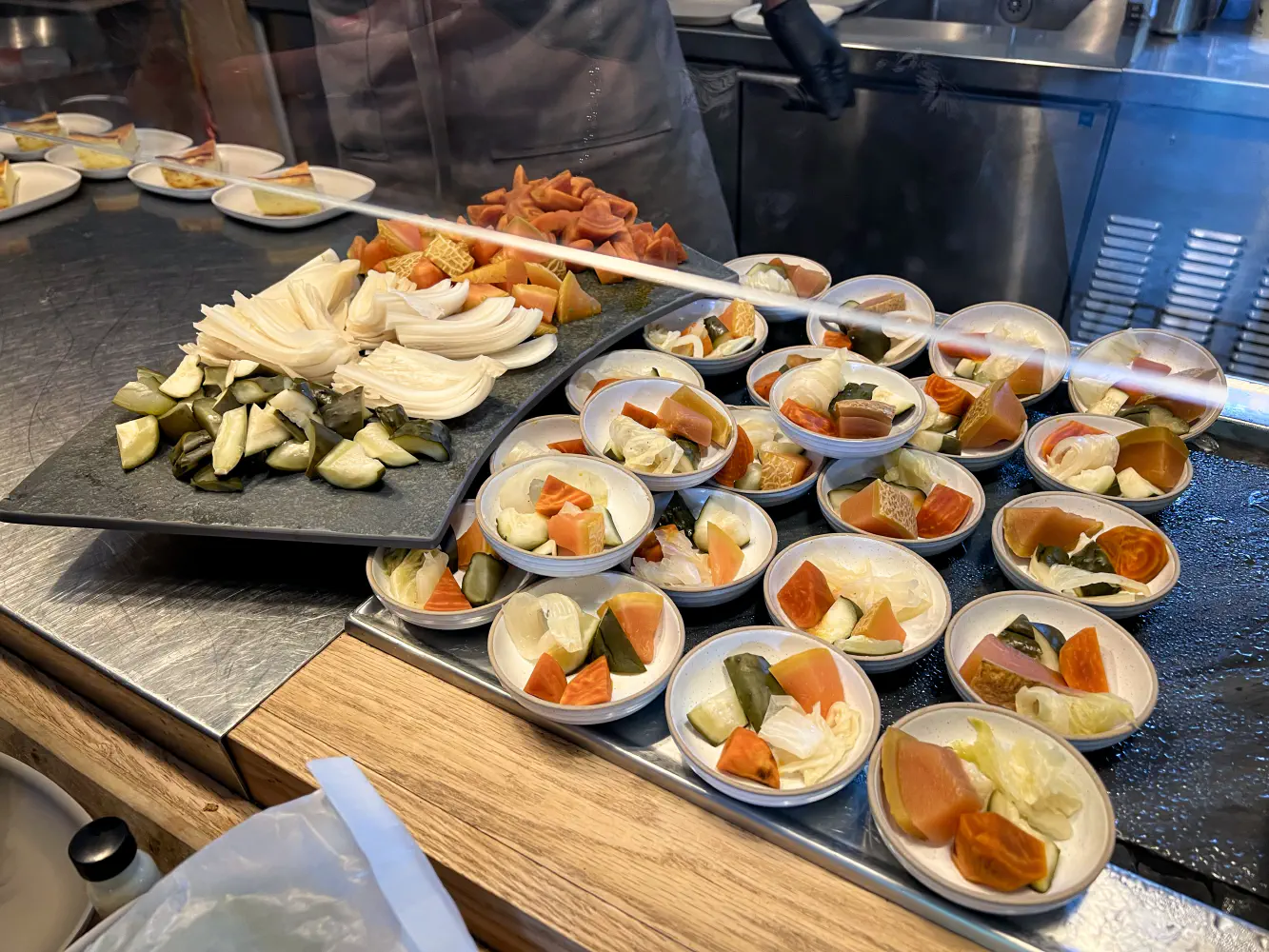 The pickles are already prepared already. It had some sort of melon, squash, cucumber, and cabbage.
