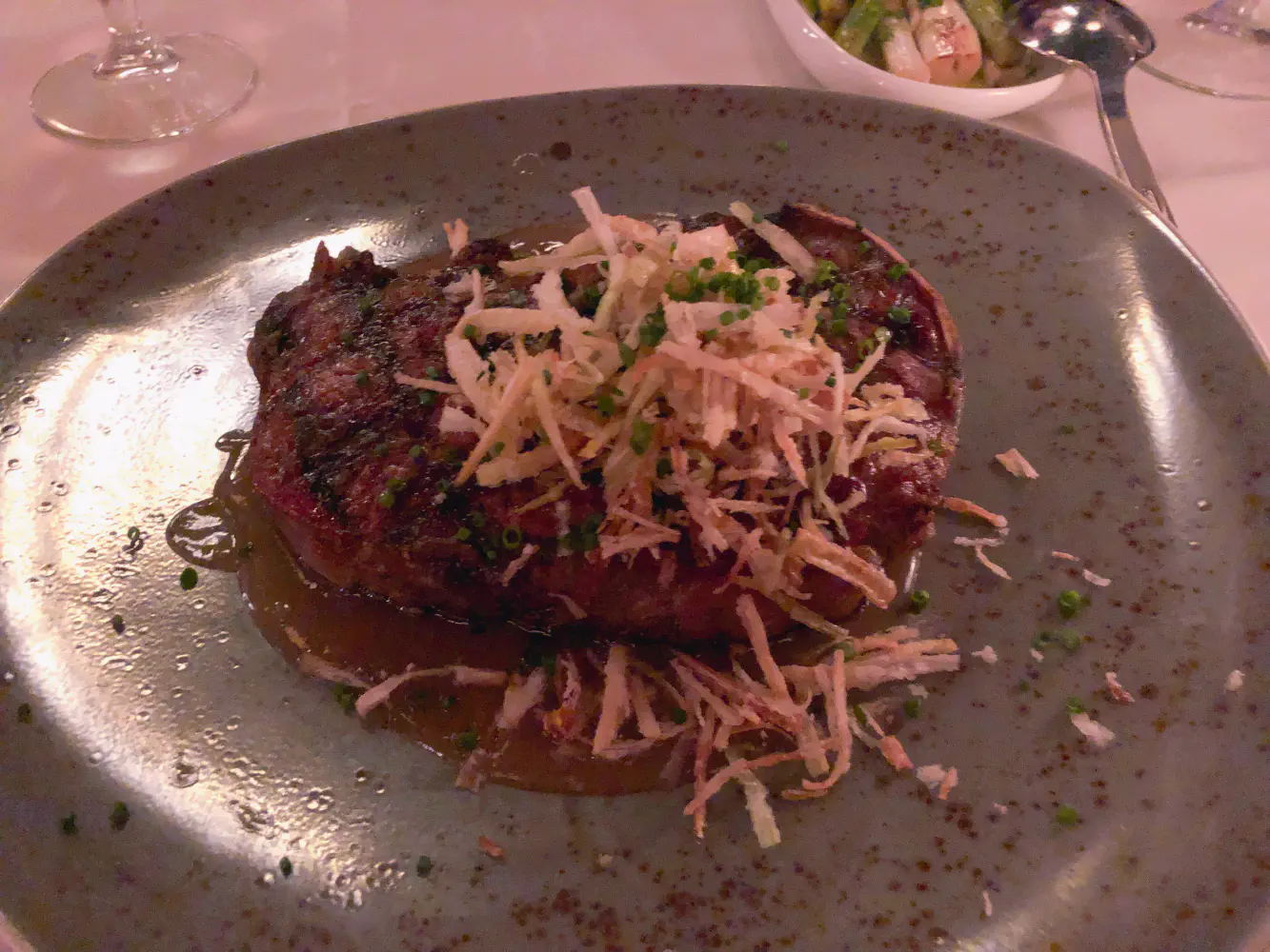 The 16 oz bone-in Angus New York Strip has frizzled leeks, Maldon sea salt, and beef au jus. The steak was cooked at a perfect medium rare. It wasn’t the best cut I’ve had, but it wasn’t bad either. The things on top reminded me of fried onions. The sauce around the steak was salty, but it was a good complementary sauce to the steak. I think the meat near the bones though was a little chewy.