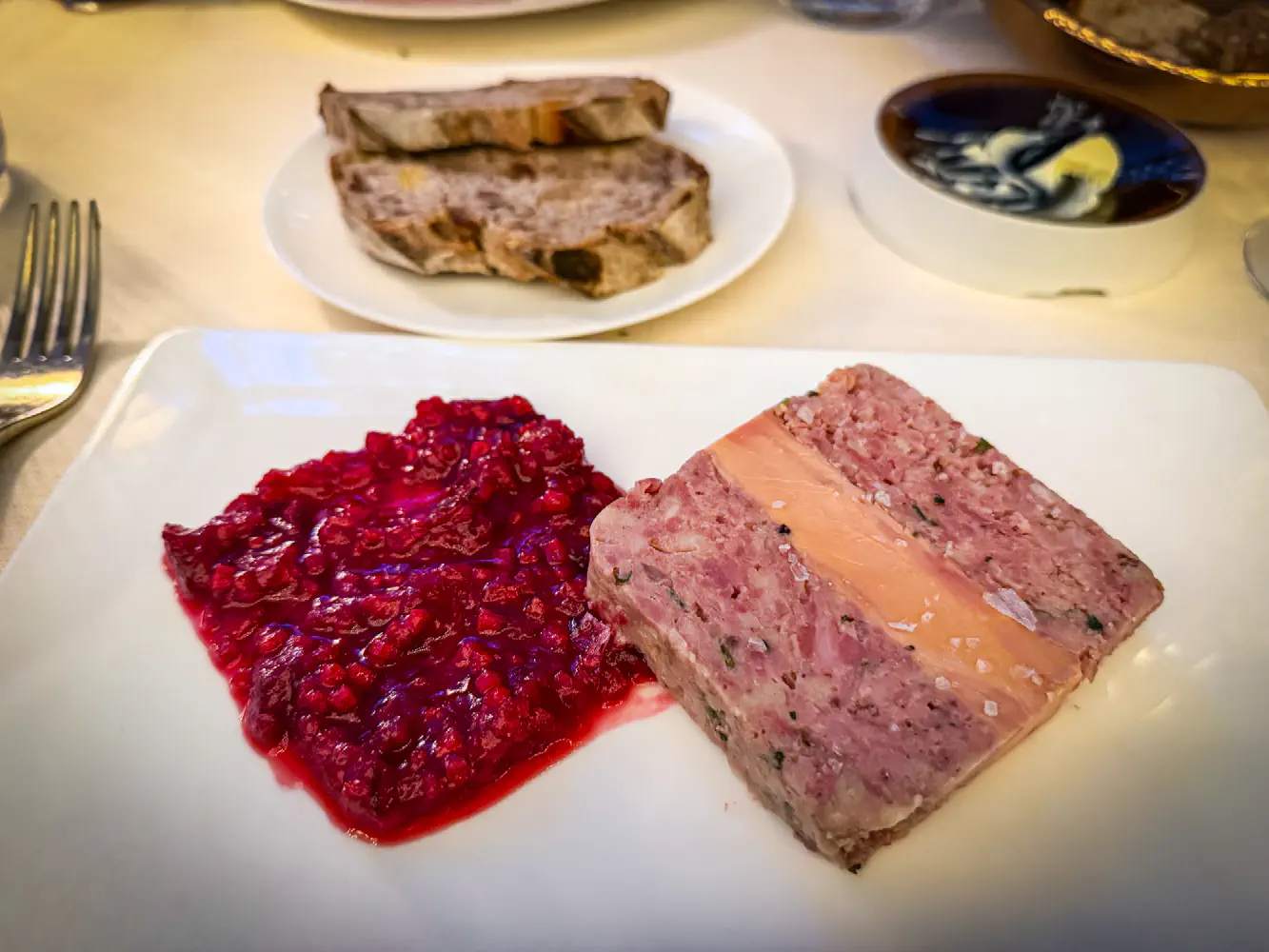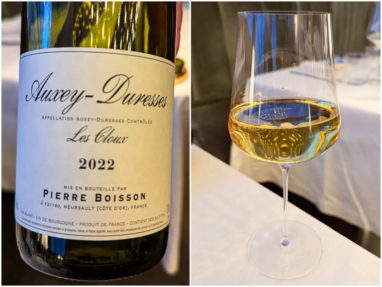 The glass of Chardonnay ‘Les Clous’ ($45) came from Pierre Boisson, Auxey-Duresses, Burgundy, France 2022. This was a surprisingly very delicious chardonnay. It was very smooth and buttery, but with some interesting, complex notes. It was a very apparent yellow color with some earthy and minerality notes to it. It paired good with my foie gras terrine.