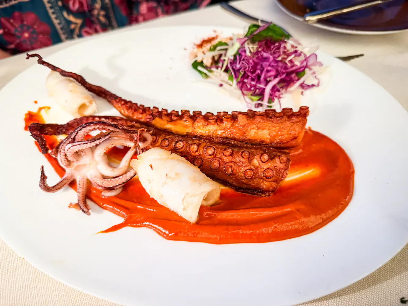 My partner ordered the Octopus & Squid a la Plancha, which came with kohlrabi slaw, cashew, and romesco sauce. We were both surprised by how large this dish was, as they gave 2 octopus legs. The legs were cooked nicely, though not the best I’ve had. They were tender and bouncy and not overcooked. The squid was crunchy and also pretty good. The romesco sauce was a bit peppery for my partner, so be aware if you’re susceptible to heat.