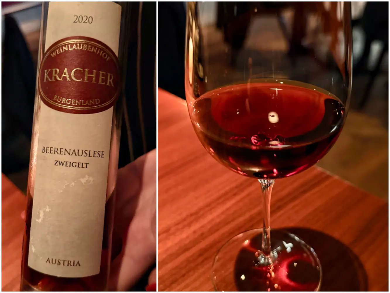 For the desserts and Pear & Parsnip, this was the Kracher, Zweigelt, Beerenauslese from Burgenland, Austria 2020. This dessert wine has a very bright aroma of a myriad of different cherry flavors. It was rich and sweet and ultra smooth.