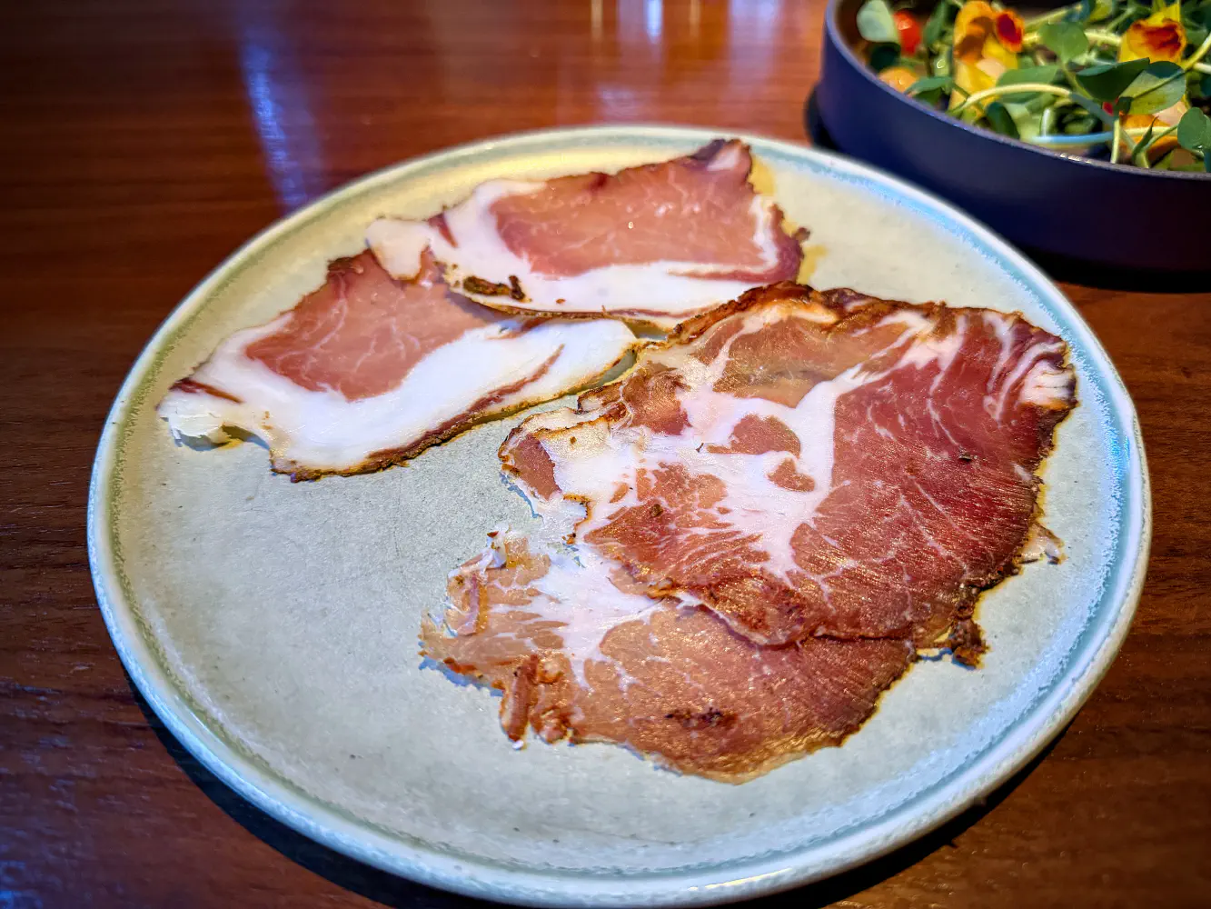 The Charcuterie came with coppa and lonza. Coppa is the circular shaped slice and is an Italian cured pork, made from the pork shoulder and neck. The lonza is made from the loin. This was definitely a bit more salty than the coppa.