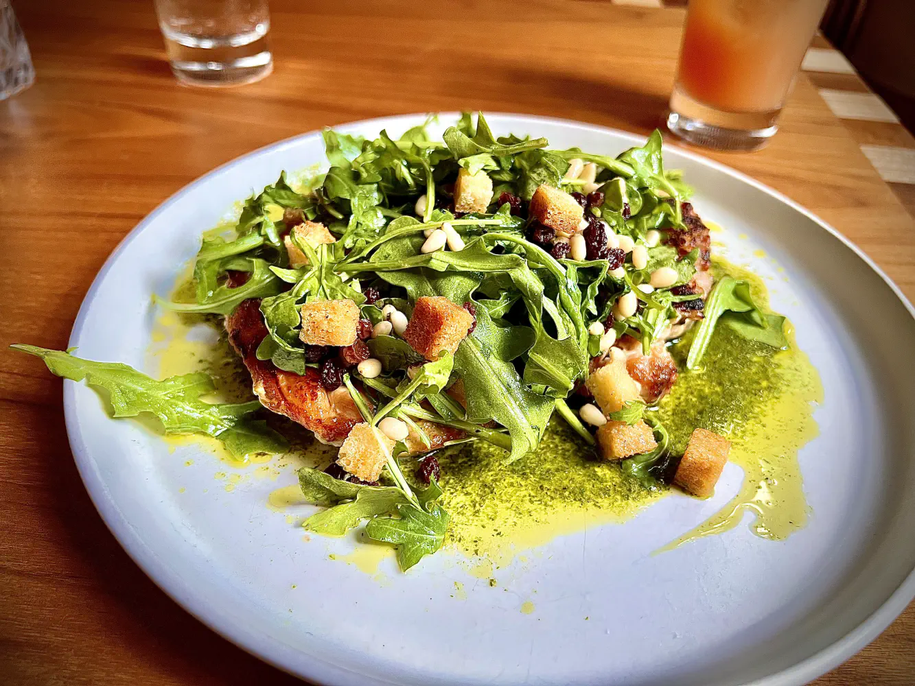 The Roasted Amish Chicken entree came with pine nuts, currants, arugula, tuscan croutons, and sherry vinegar. The amish chicken unfortunately was very dry around the breast, and it lacked basic seasoning on it in general. The dark meat was juicy, and the skin was crispy. But unfortunately, it was lacking any seasoning.