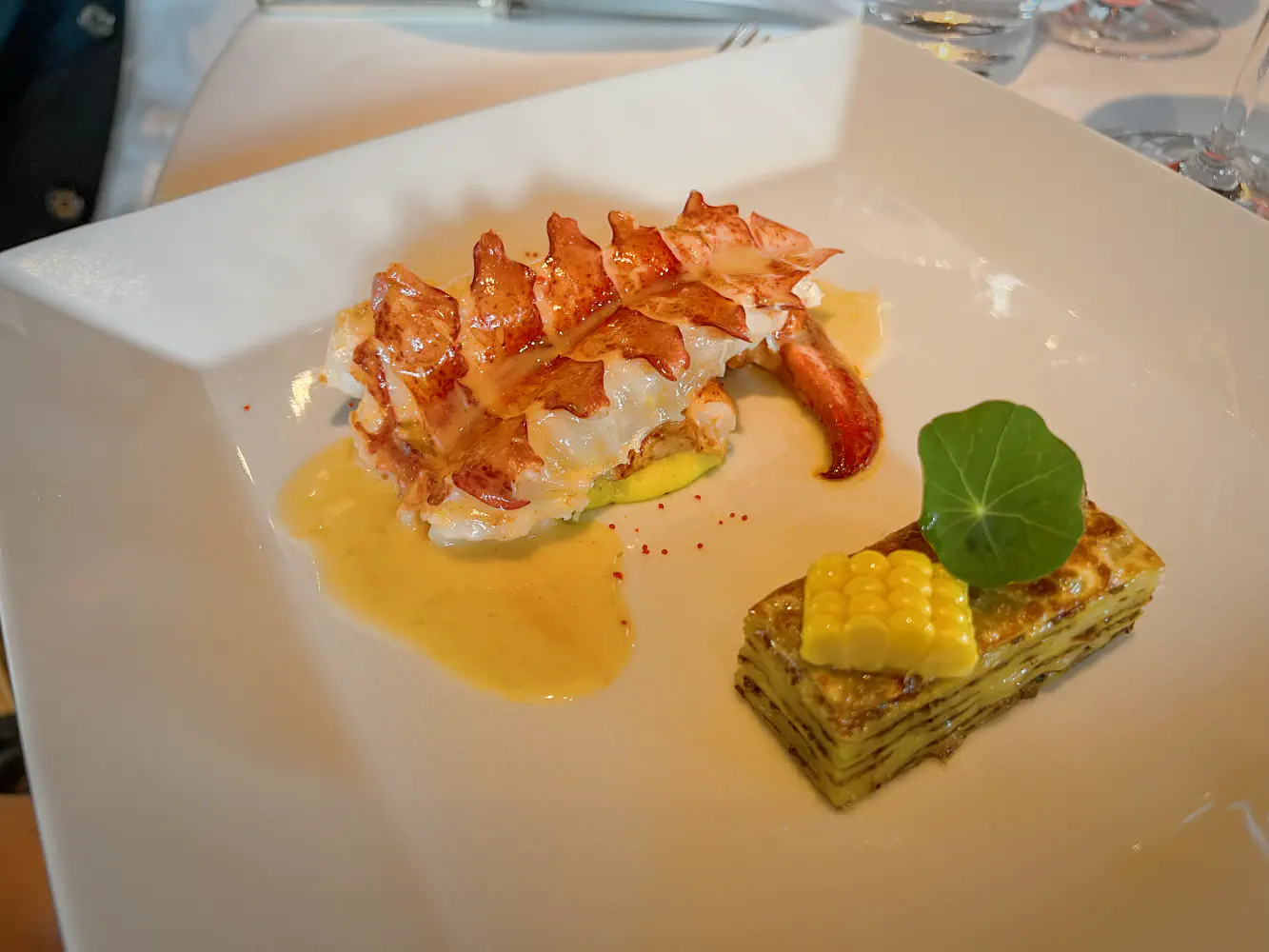 For the second course for another guest, they ordered the Lobster, which came with poached Nova Scotia lobster tail, summer corn, Chanterelle mushroom lasagna, and Ver jus sauce. The mushroom lasagna was described to be very delicate, and the pasta was thick and didn’t fall apart. The lobster tail was very sweet and delicious.