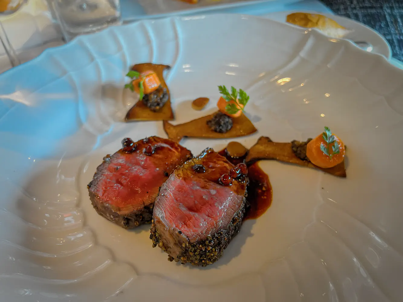 For the second course, my partner ordered the Venison, which came with fallow venison loin, roasted King Trumpet mushrooms, glazed carrots, spinach spaetzle, and lingonberry jus. The venison was absolutely delicious, and I would recommend people order this if they wanted something unique out of this restaurant.