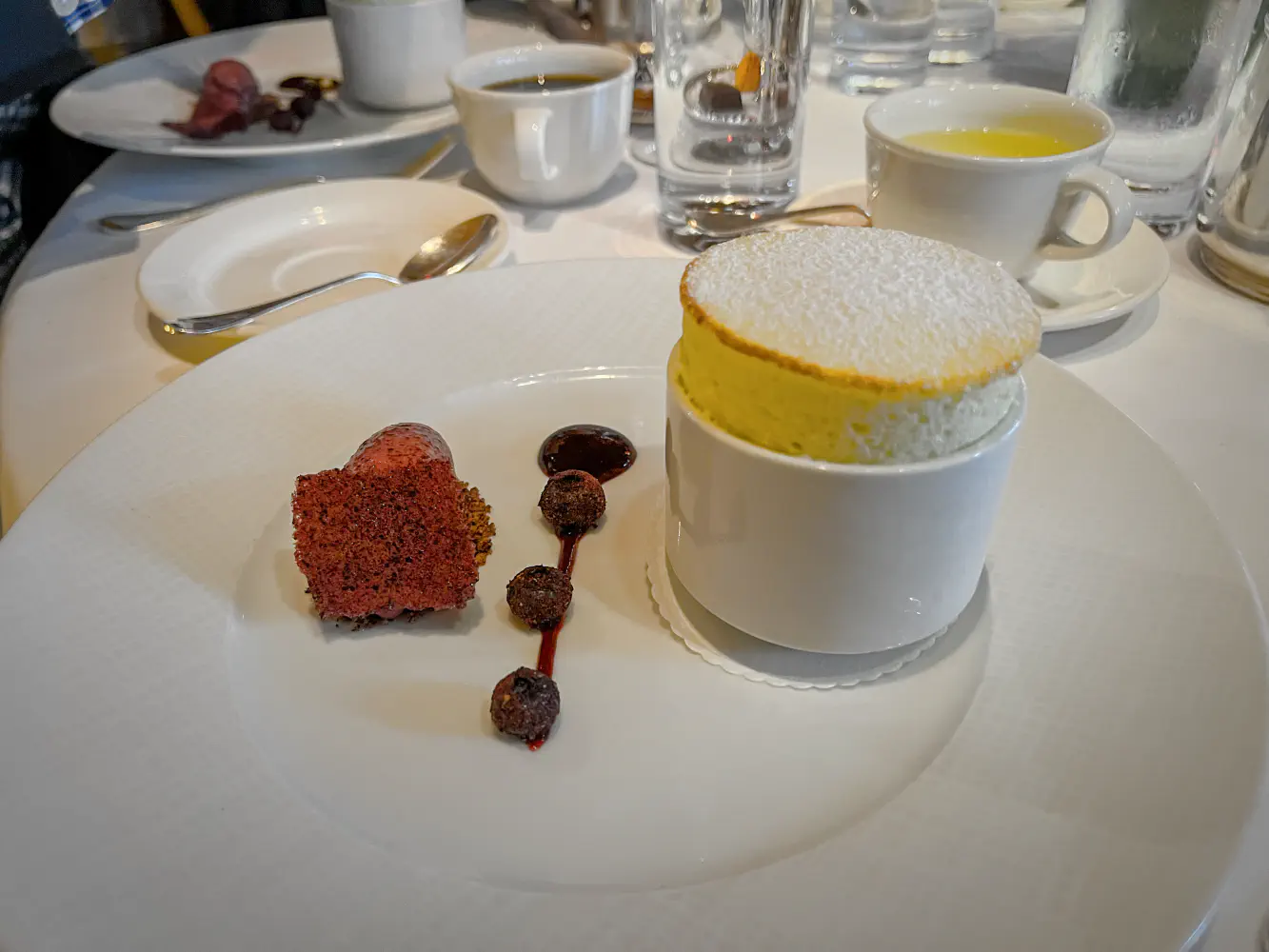 For the third and final course, others ordered the Lemon Souffle, which came with warm lemon souffle, candied lemon zest, Maine blueberry sherbet, and blueberry crumble.