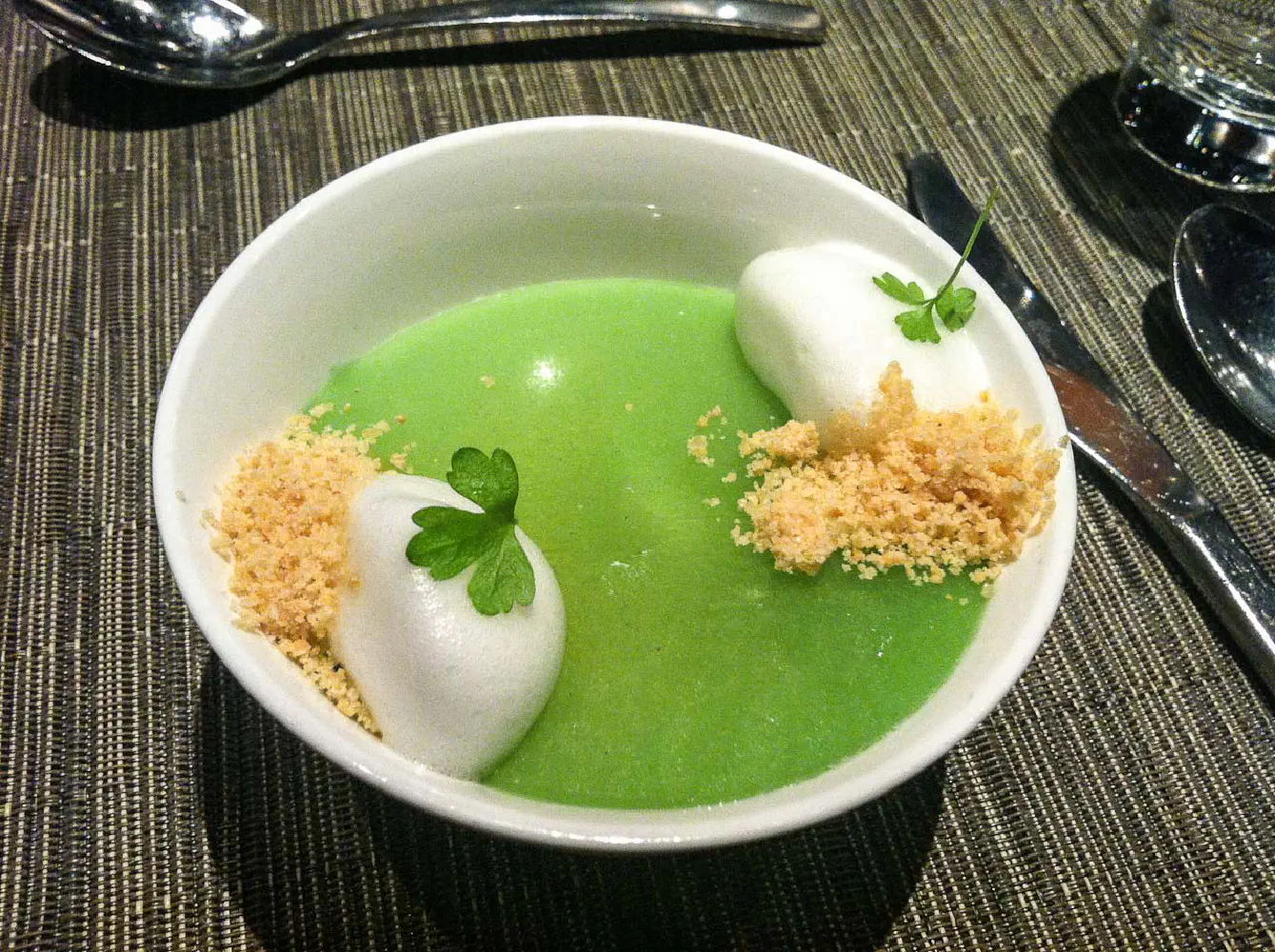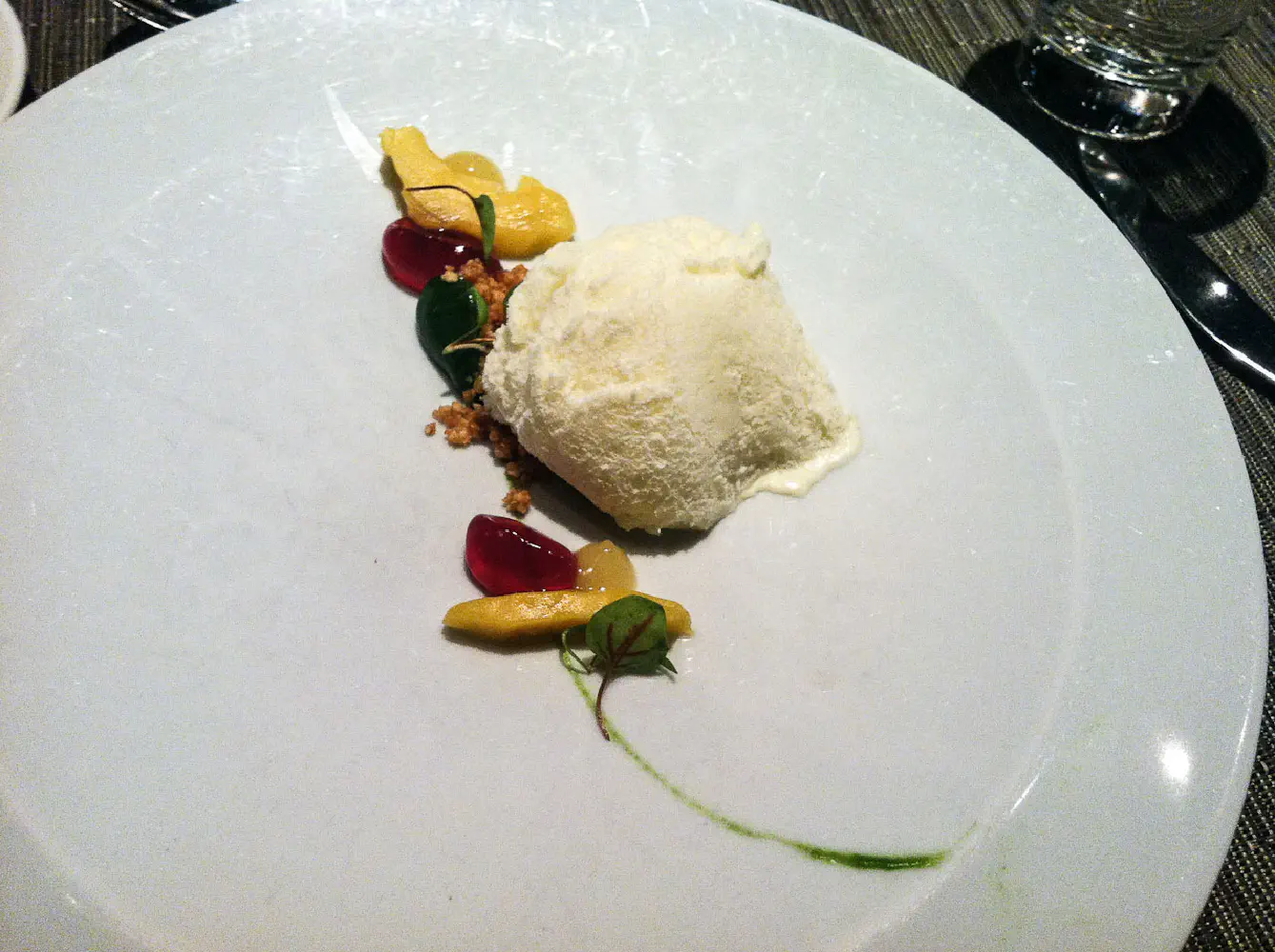 10. Jasmine, cucumber, quince, chartreuse. This was a very interesting dessert. The finely orange shavings are somewhat salty. The white is some type of foam. The green “ice” tasted like cucumber and is not as hard as it looks like. When you break the “ice”, there are a bunch of random things underneath. I recall that was some type of cream that tasted like fruit. Individually, they each tasted remarkably different, but together in one scoop, they tasted really awesome.